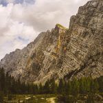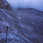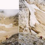 Nakon dvadesetak minuta hoda dolazimo do snijega, a zatim do stijene kojoj se vrh ne nazire i blijede crvene strelice prema gore. Sve odiše kao da nitko nije tuda prošao mjesecima ako ne i godinama, no odluka je pala da se popnem tridesetak metara kako bih provjerio je li postoje klinovi i sajle za penjanje.