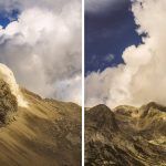 S obzirom da smo na već poprilično ozbiljnoj visini oblaci se izmjenjuju poprilično brzo tako da se vrhovi oko nas vide svakih par minuta na desetak sekundi tako da zaista niti ne slutimo u što se upuštamo.