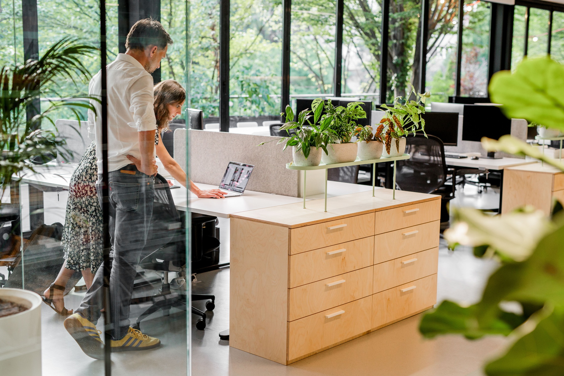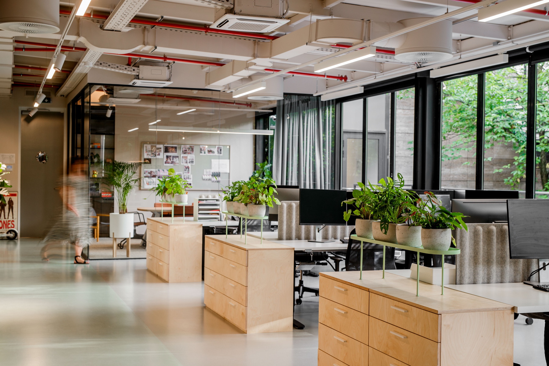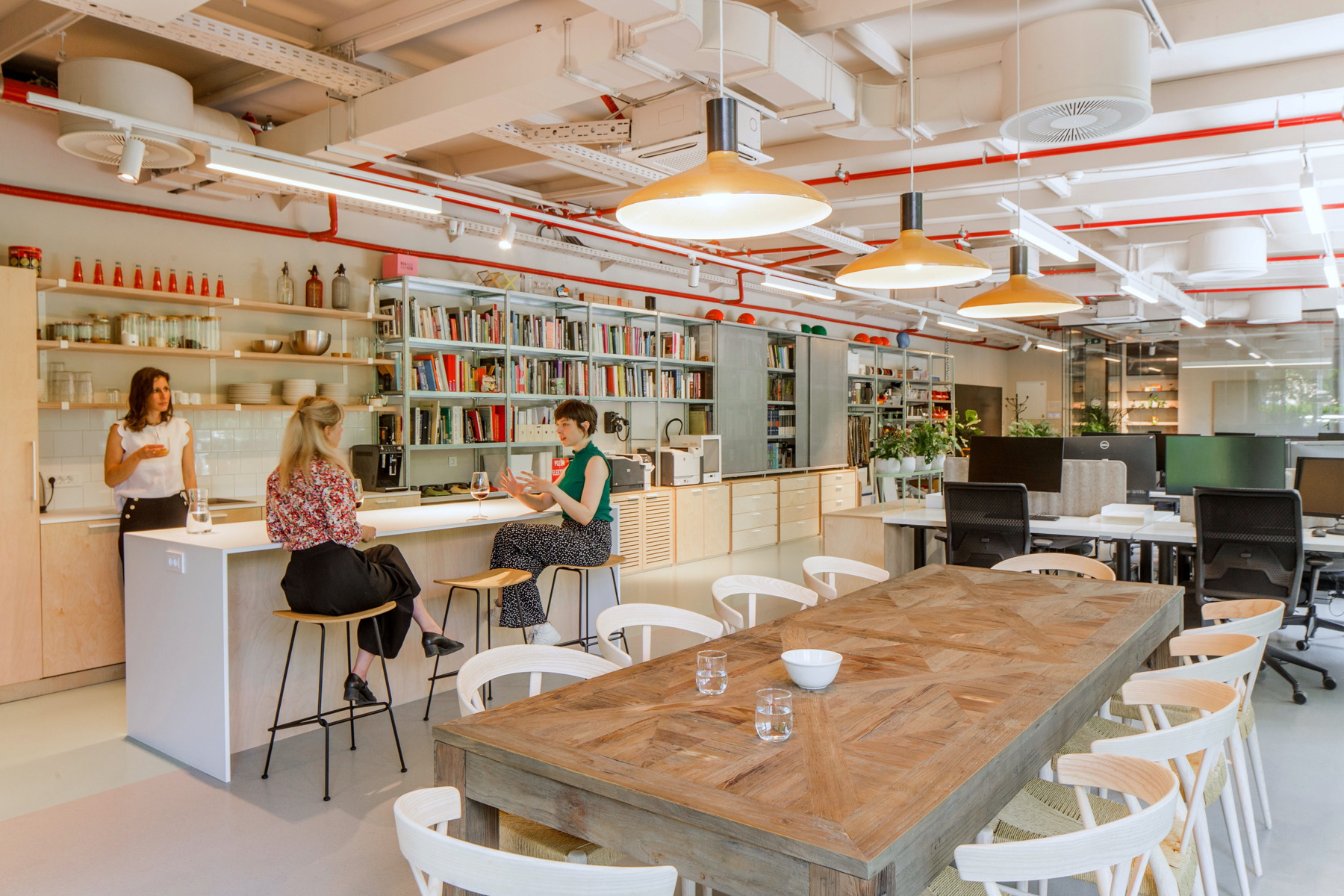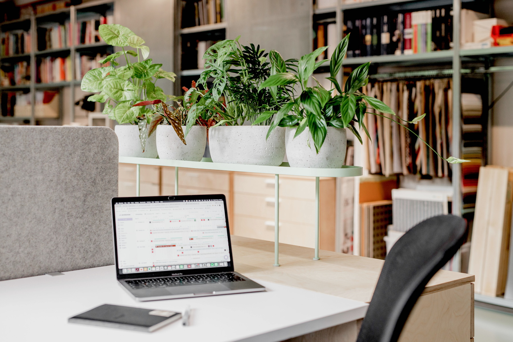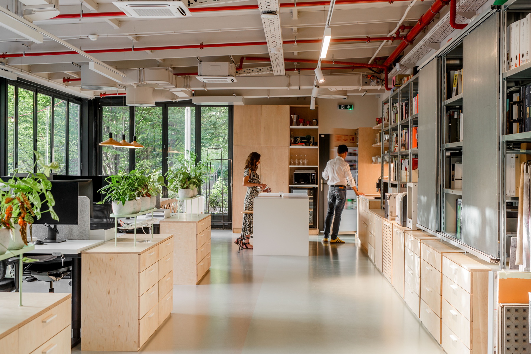 Osim radnih jedinica koje su razdijeljene akustičnim pregradama, bitan element u prostoru je velika biblioteka s uzorcima, stručnom literaturom te panelima za moodboarde i razradu procesa dizajna.