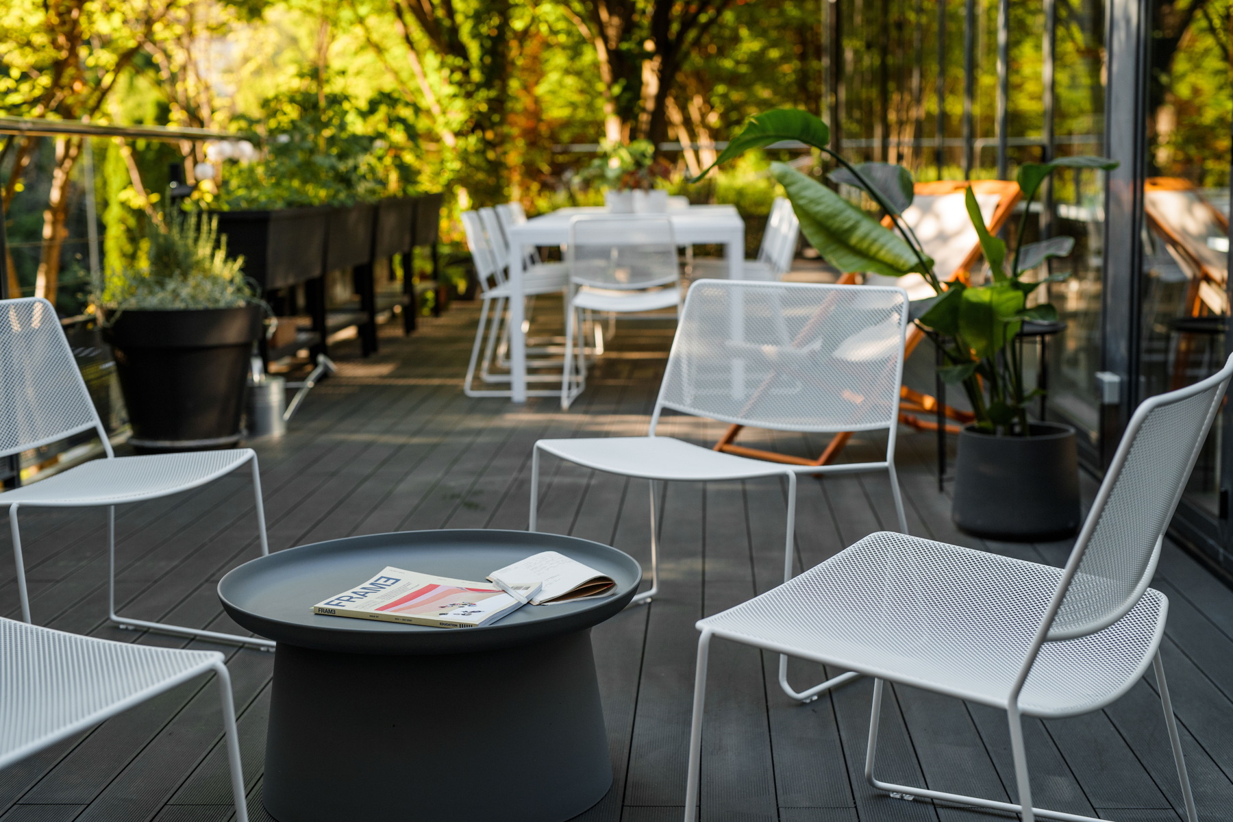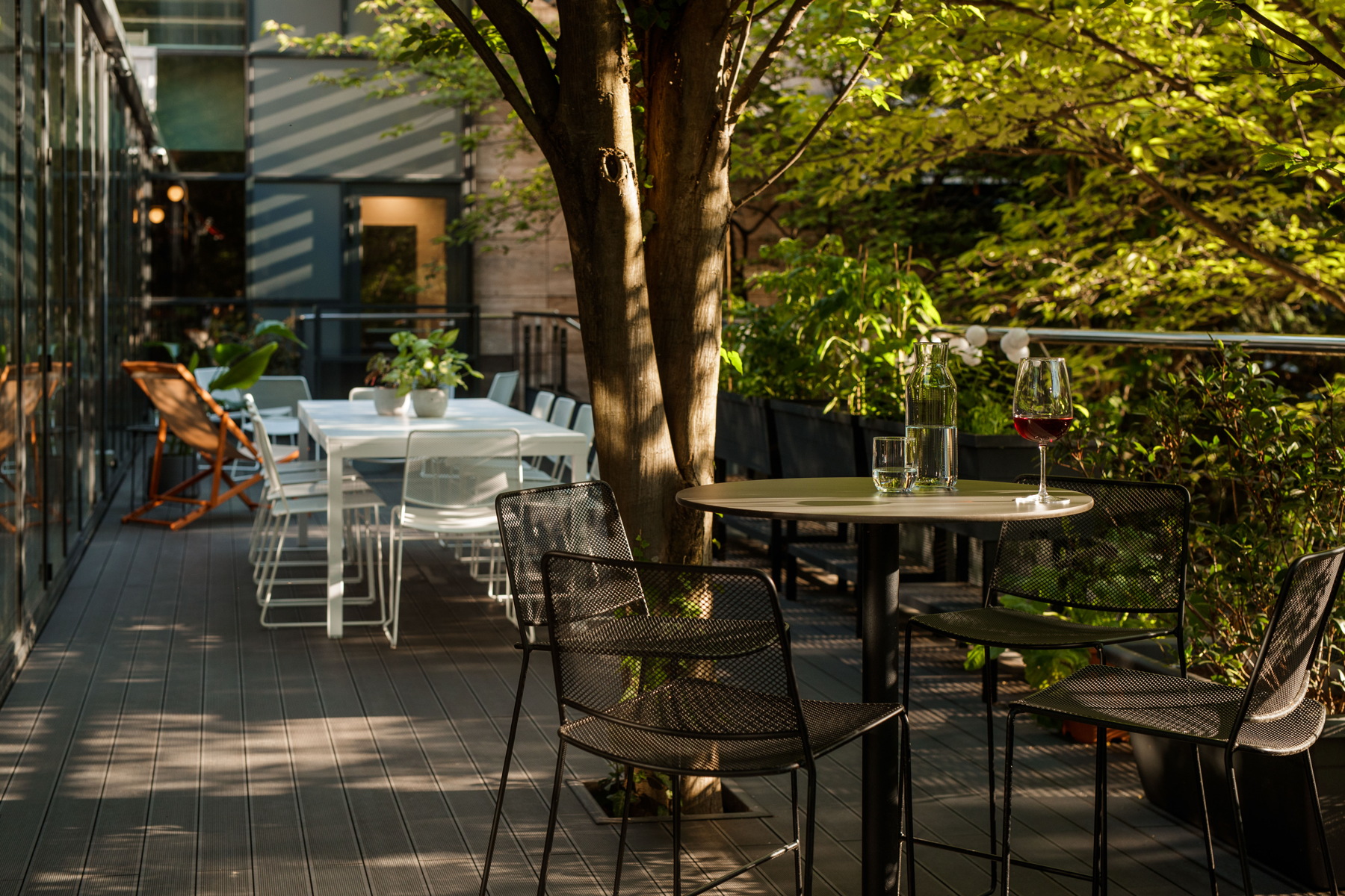 Terasa utopljena u park, kroz koju i raste drveće često postaje alternativni radni prostor u hladu japanskih trešanja, ali i ljetna blagovaonica te urbani vrt u kojem se uzgajaju ekološke jagode, rajčice, paprike, tikvice, salata i razno začinsko bilje koje redovito koristimo za pripremanje naših obroka. Tu je i mali „pašnjak“ za pčele, s cvijećem koje omogućuje kukcima da se nahrane unutar gradskog centra.
