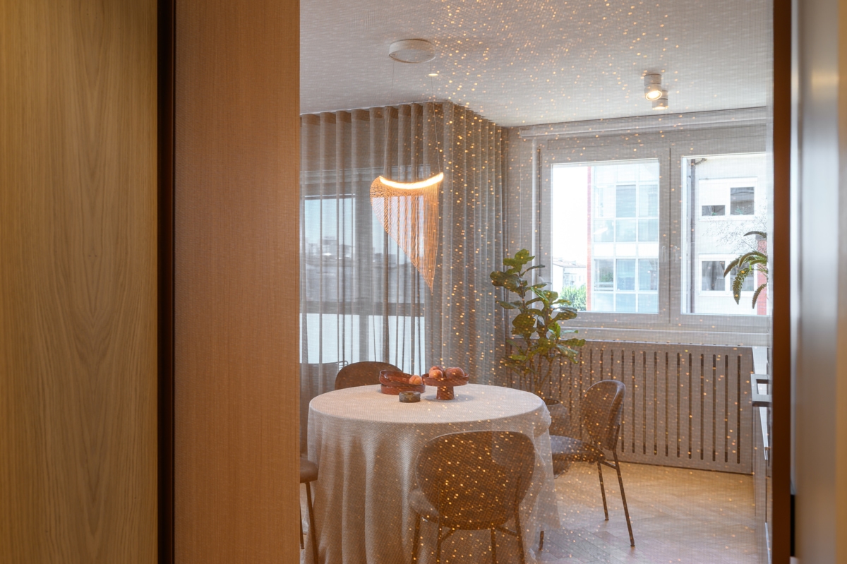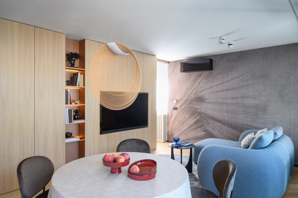 – Dnevni dio promišljeno je oblikovan i na ograničenoj površini nudi svu udobnost kakvu obično pružaju veći prostori. Praktičnost odabranih elemenata upotpunjuju snažni vizualni akcenti koji privlače pogled: klizna staklena vrata s metalnom mrežicom između staklenih površina, proizvođača Bokart; elegantno viseće svjetilo brenda Luceplan; te plavi kauč brenda Kave Home koji se skladno povezuje s dekorativnom tapetom tvrtke Glamora.