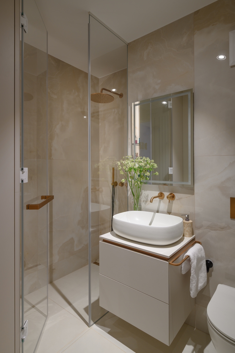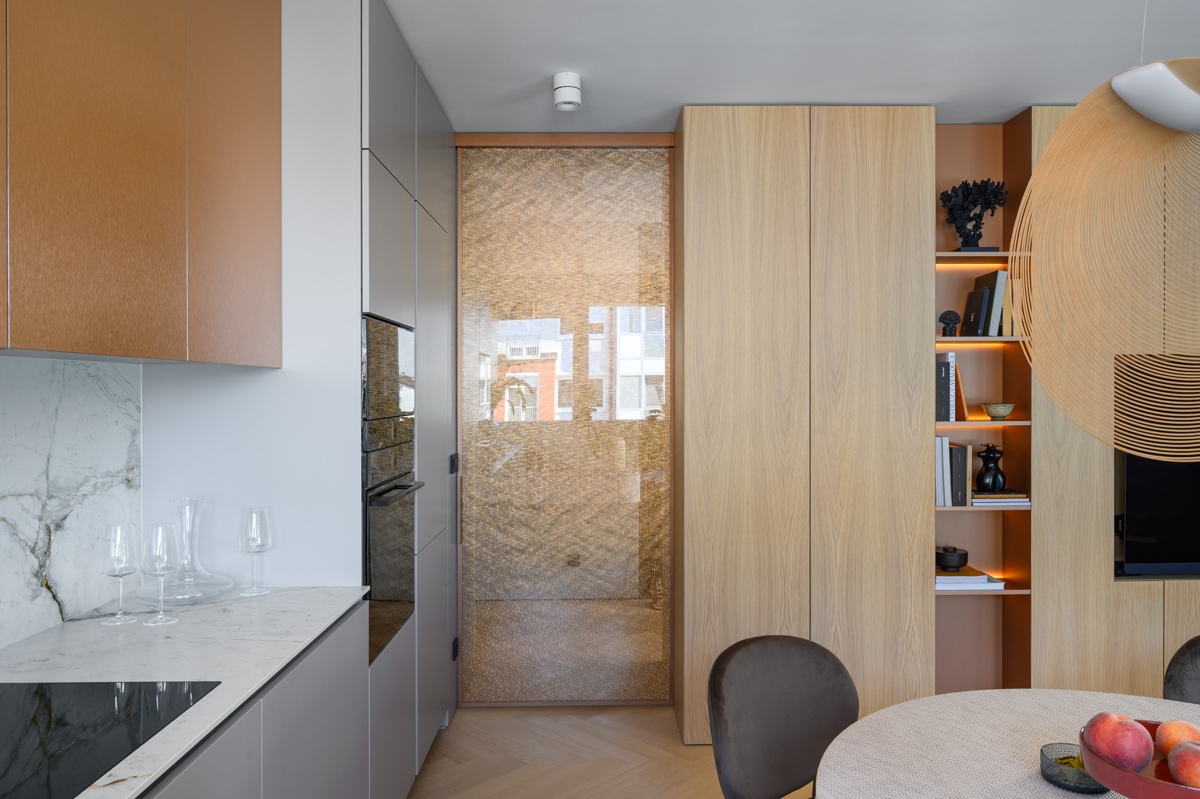 Paleta materijala temelji se na prirodnim, taktilnim materijalima poput drva, kamena i bakra. Topli bež i sivi tonovi nadopunjeni su bogatim teksturama koje omekšavaju svjetlost i stvaraju osjećaj doma i topline.