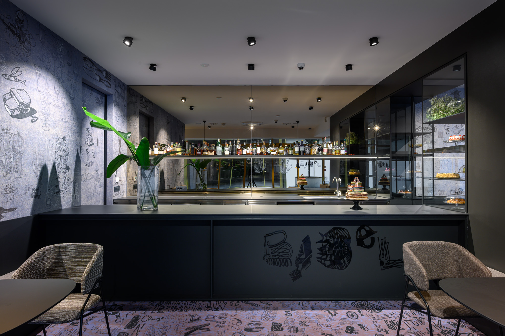 Pri ulasku u kafić prvo nas dočekuje impozantan pult od crnog kamena iza kojeg se nalazi kulisa od zatamnjenog zrcala koja odražava kolorit prostora. To uključuje nijanse ljubičaste, smeđe i sive.
