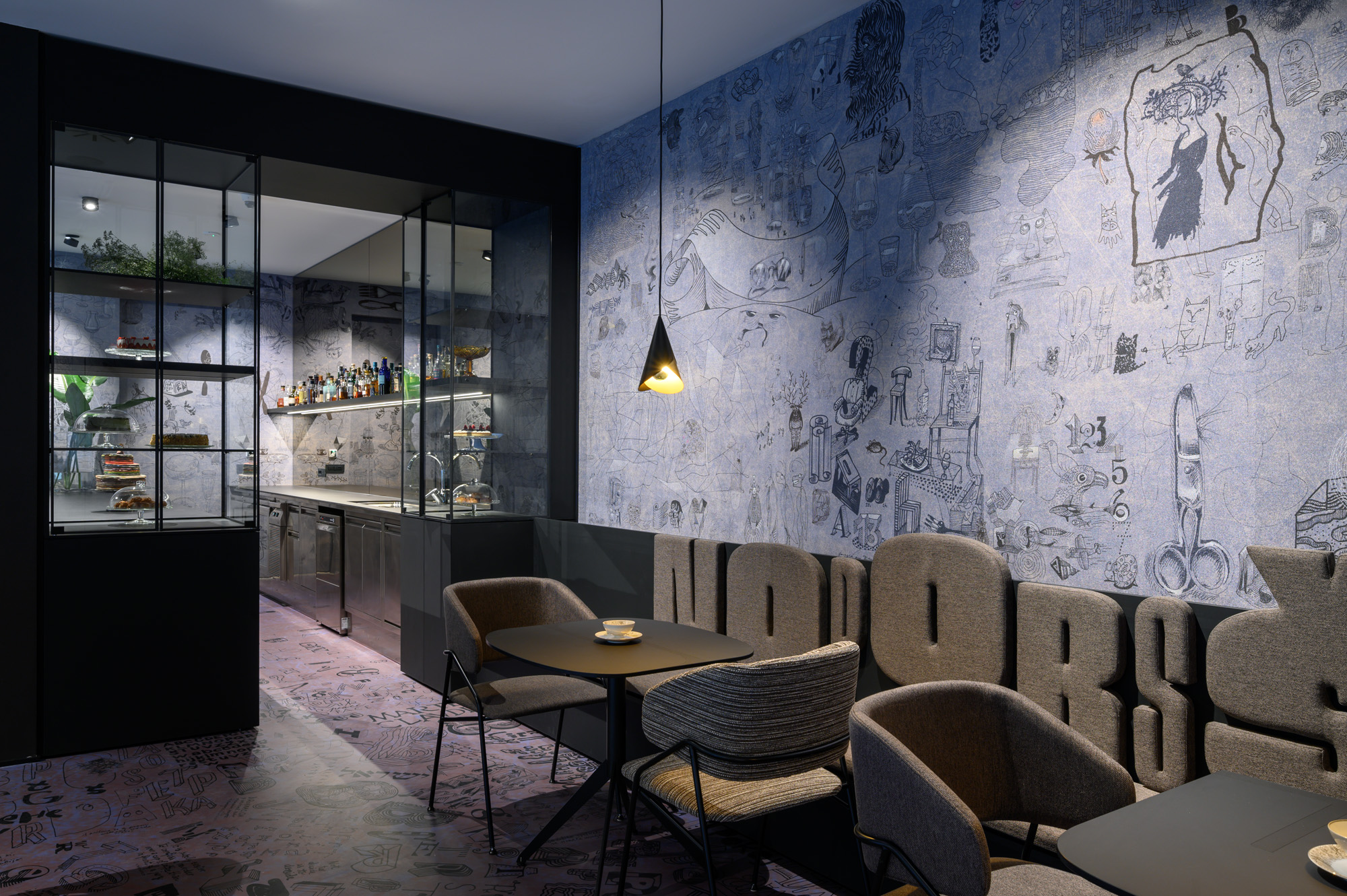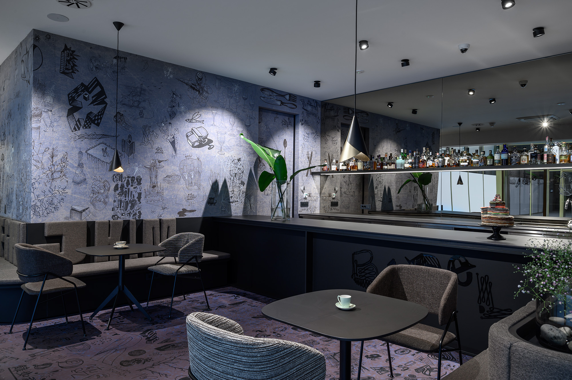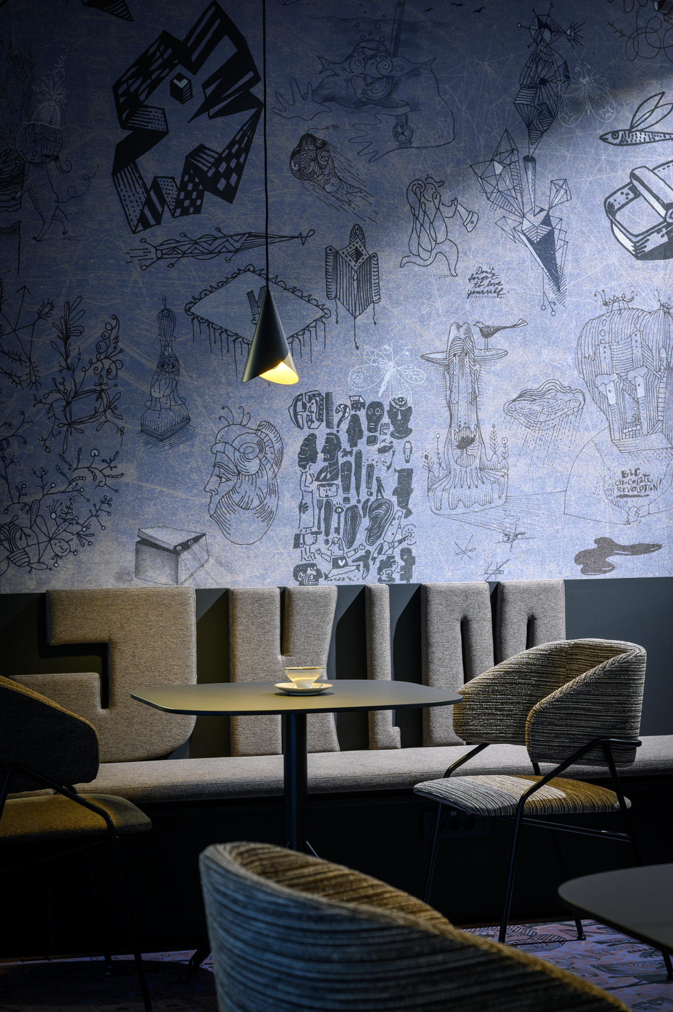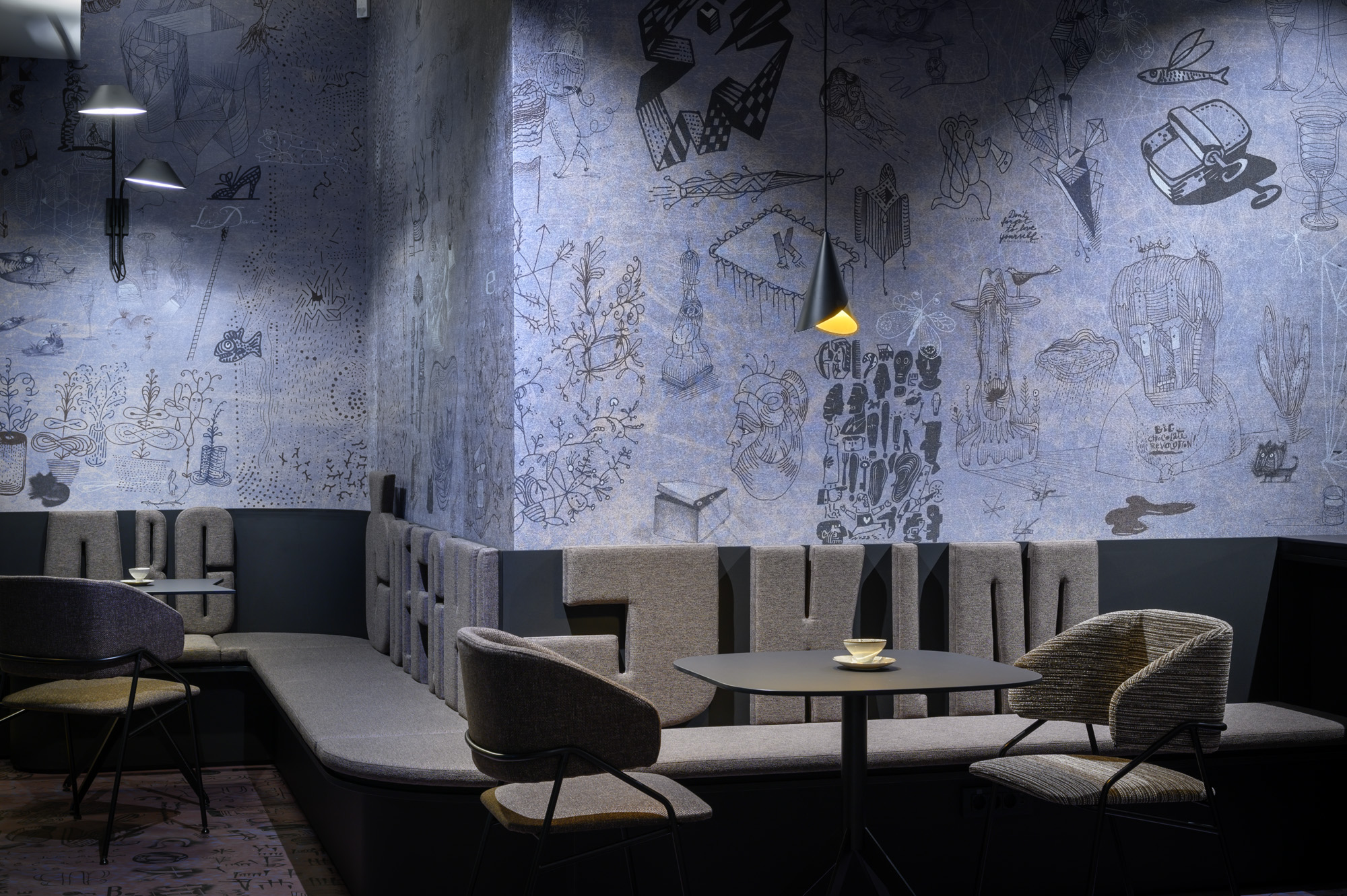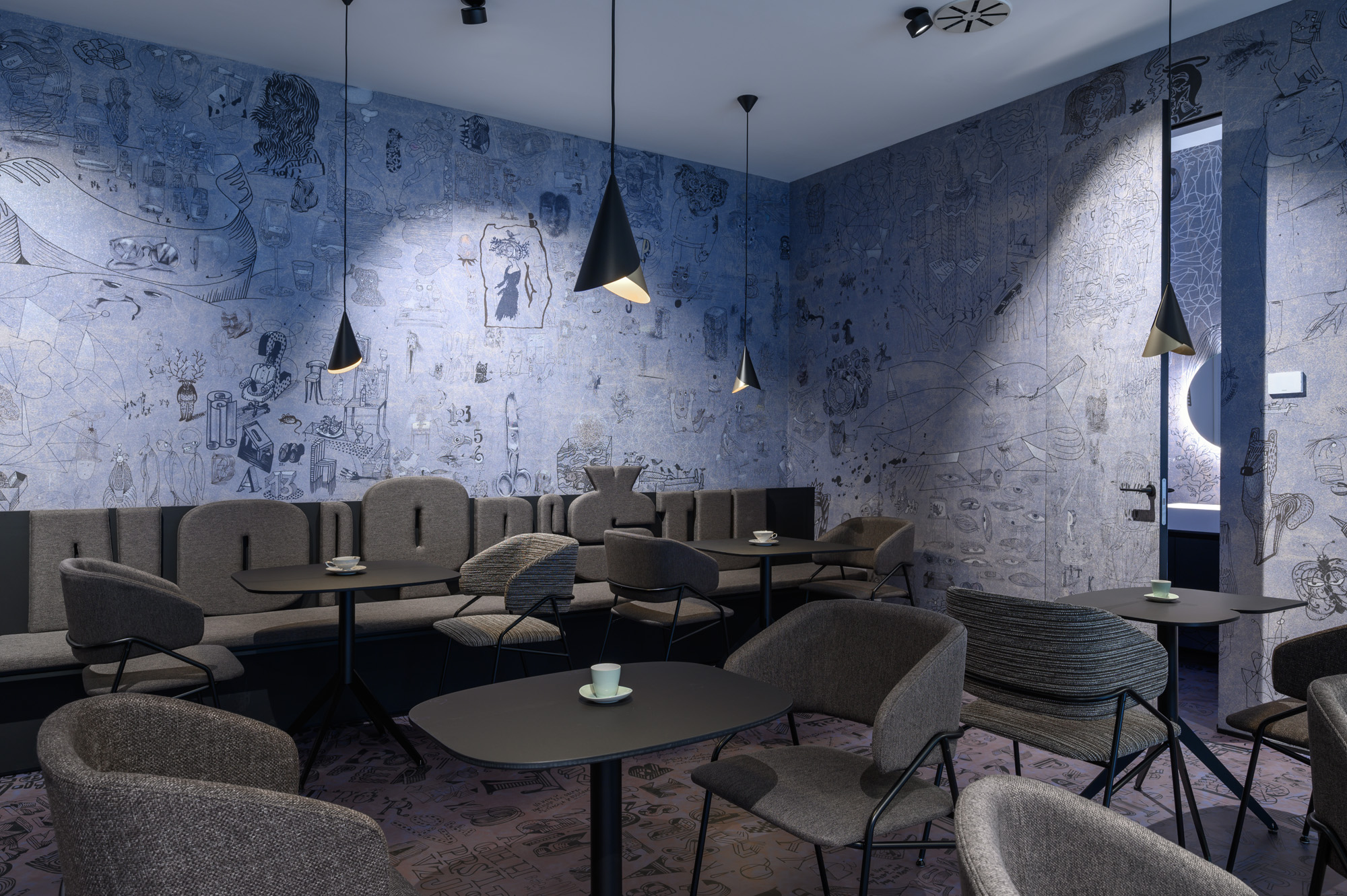 Opća rasvjeta u prostoru ne samo da stvara ugodan ambijent, već ističe i jedinstvene tapete koje je za kafić dizajnirao Radovan Jenko. Tapetu je po narudžbi izradila talijanska tvrtka Wall&decò, a zidne obloge stilski se nadopunjuju i s podnim površinama.