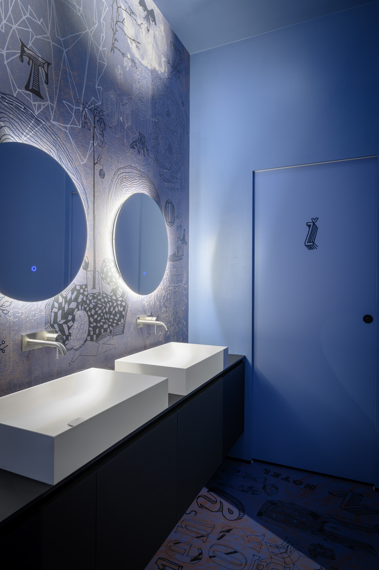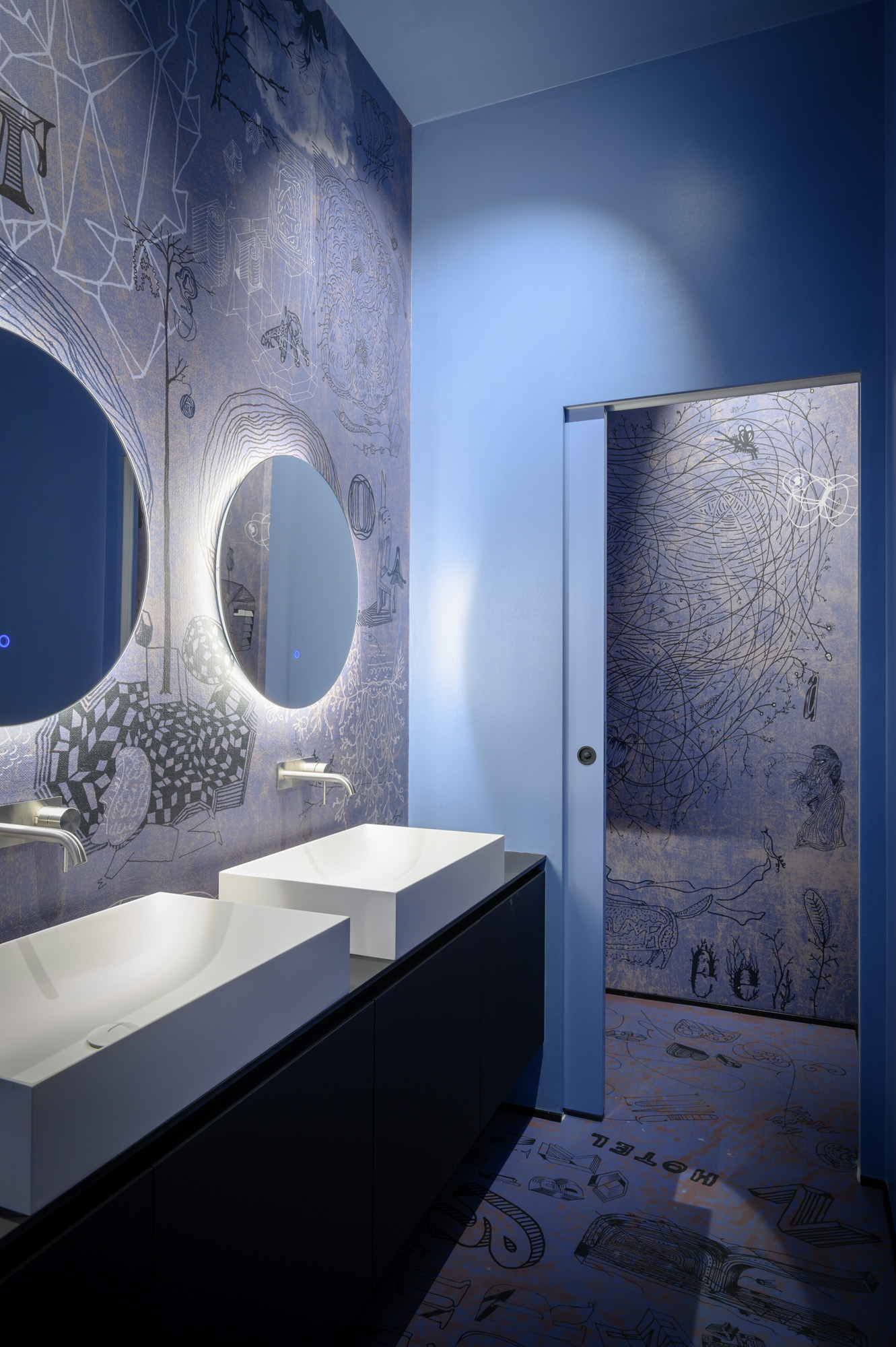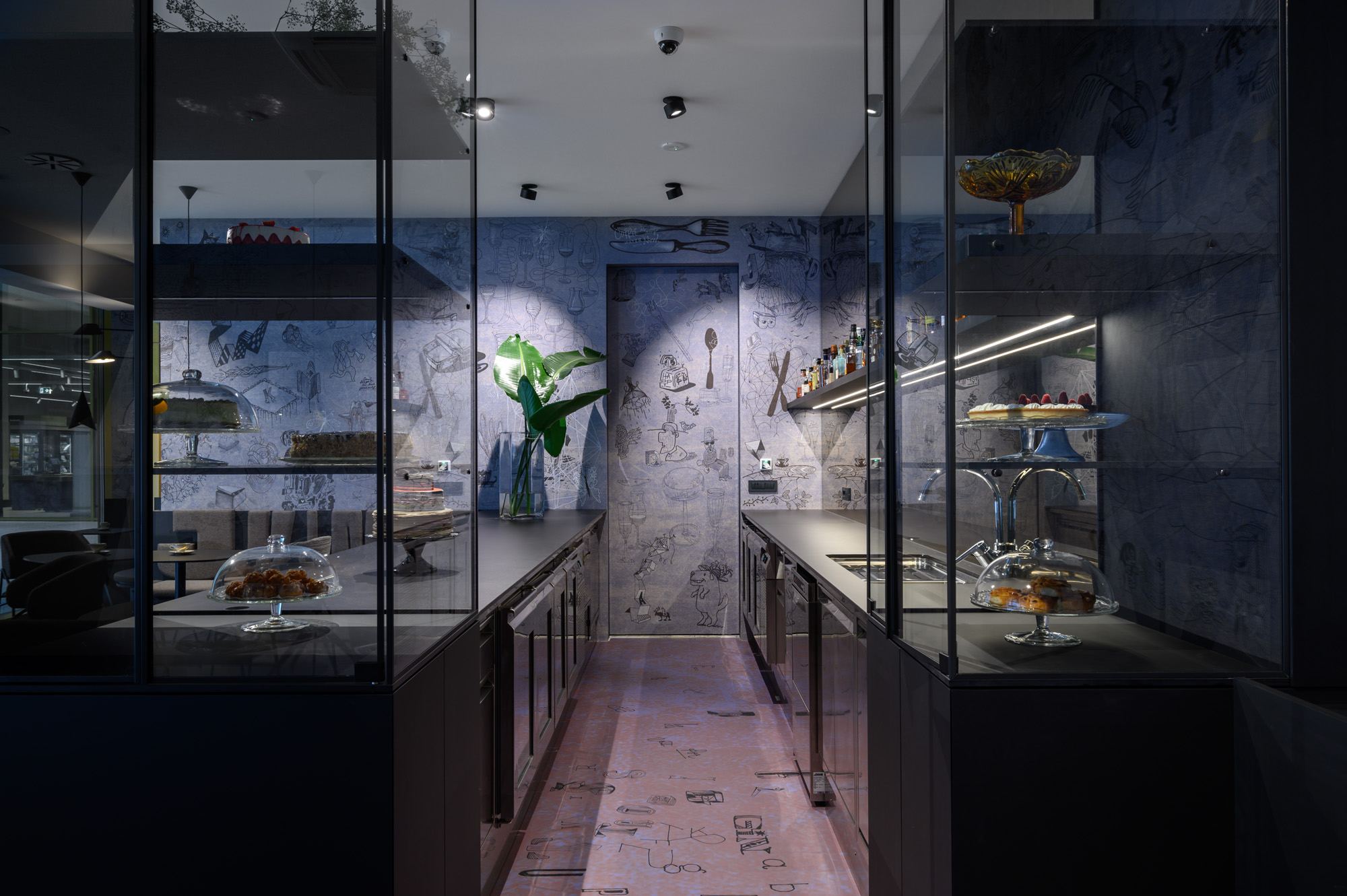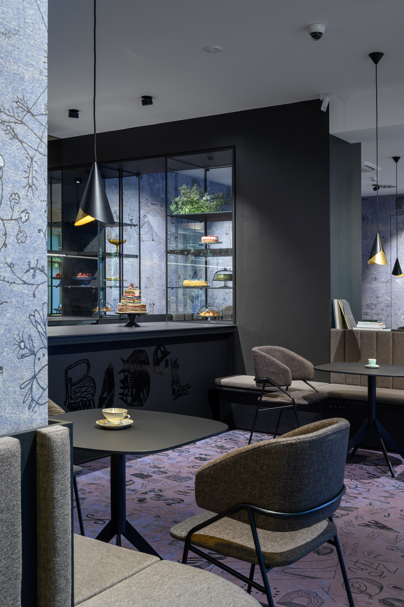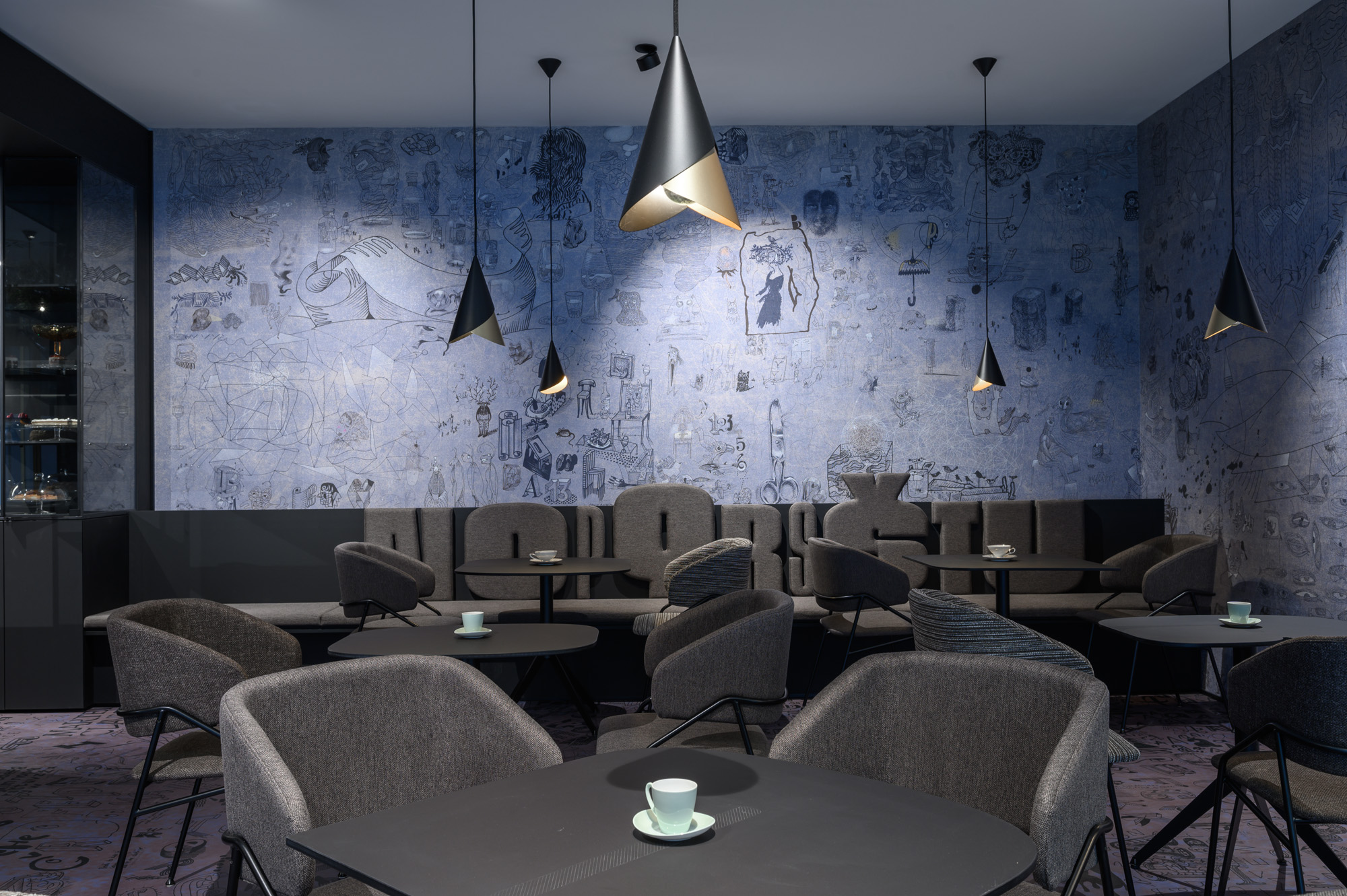 Opća rasvjeta u prostoru ne samo da stvara ugodan ambijent, već ističe i jedinstvene tapete koje je za kafić dizajnirao Radovan Jenko. Tapetu je po narudžbi izradila talijanska tvrtka Wall&decò, a zidne obloge stilski se nadopunjuju i s podnim površinama.