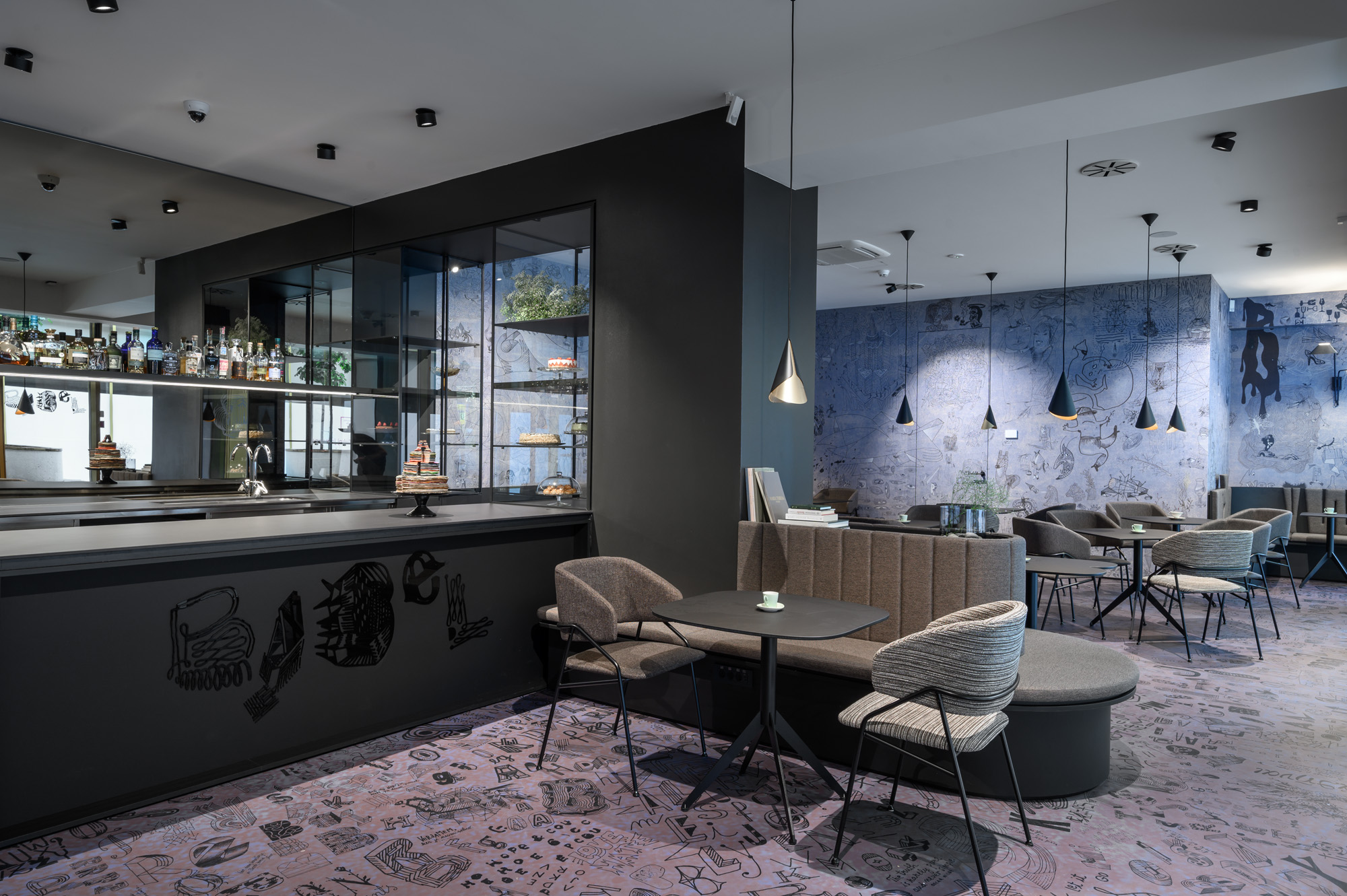 – Café Babel nalazi se u kompleksu Bellevue Living, smještenom na križanju centra grada, parka Tivoli i četvrti Donja Šiška. U želji da kafić bude više od klasičnog sastajališta, u dizajnu smo surađivali s grafičkim dizajnerom Radovanom Jenkom – rekla je arhitektica Petra Zakrajšek objasnivši kako su njezini GAO arhitekti oblikovali volumen kavane, dok je Radovan Jenko preuzeo je na sebe stvaranje likovne slike inspirirane mitološkom pričom. Zidovi, podovi, vrata, šank, separei… posvuda se proteže ta likovna slika tvoreći identitet kafića.