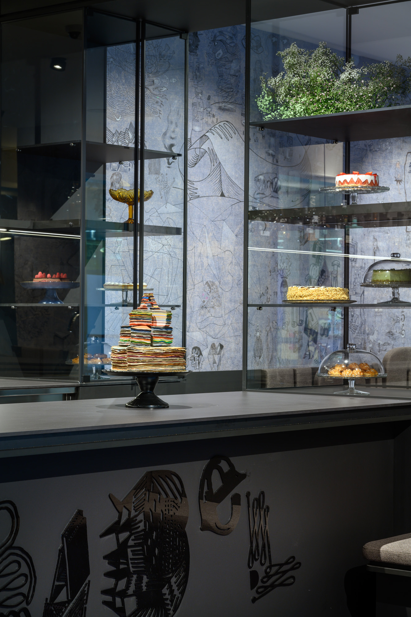 Podovi Café Babel prekriveni su s 3205 različitih ručno izrađenih kaligrafskih slova, koja sadrže 96 fraza. Tapeta koja obavija zidove ima 64,34 m² i sadrži 524 slike.