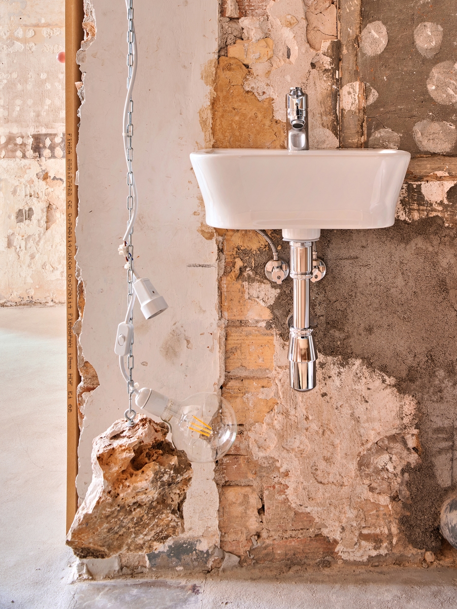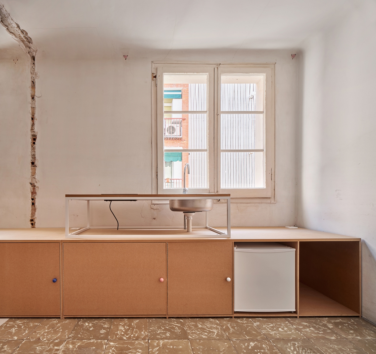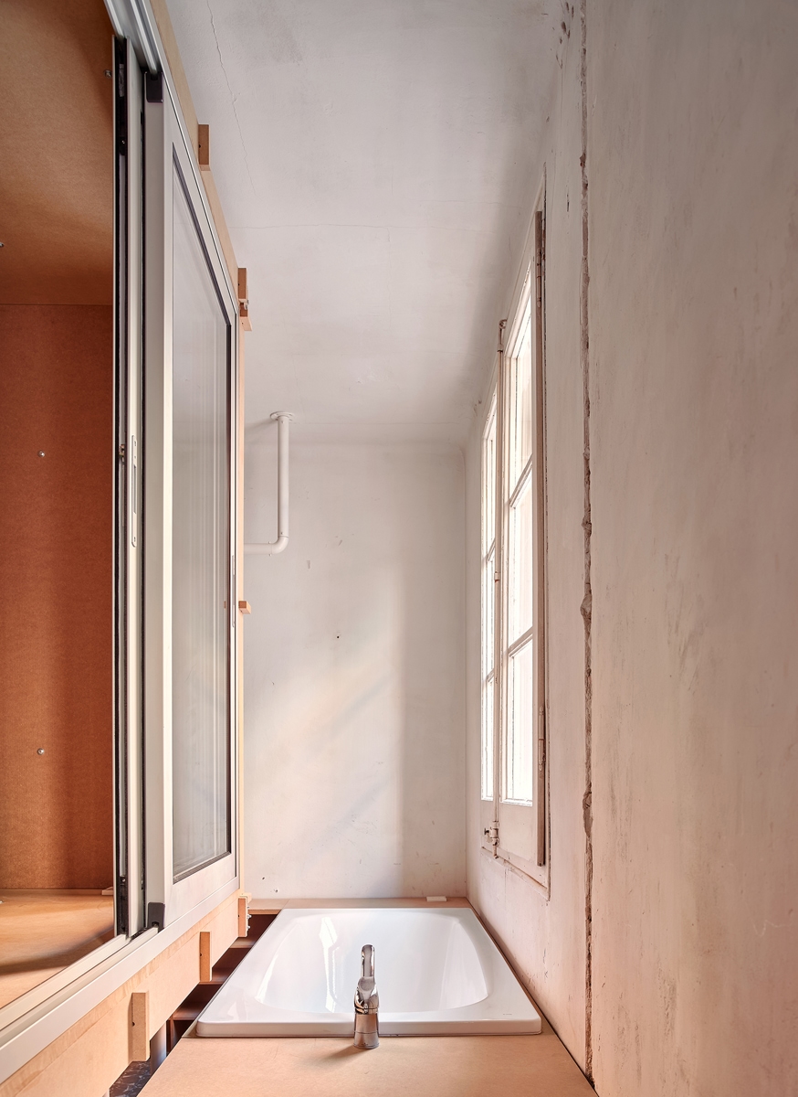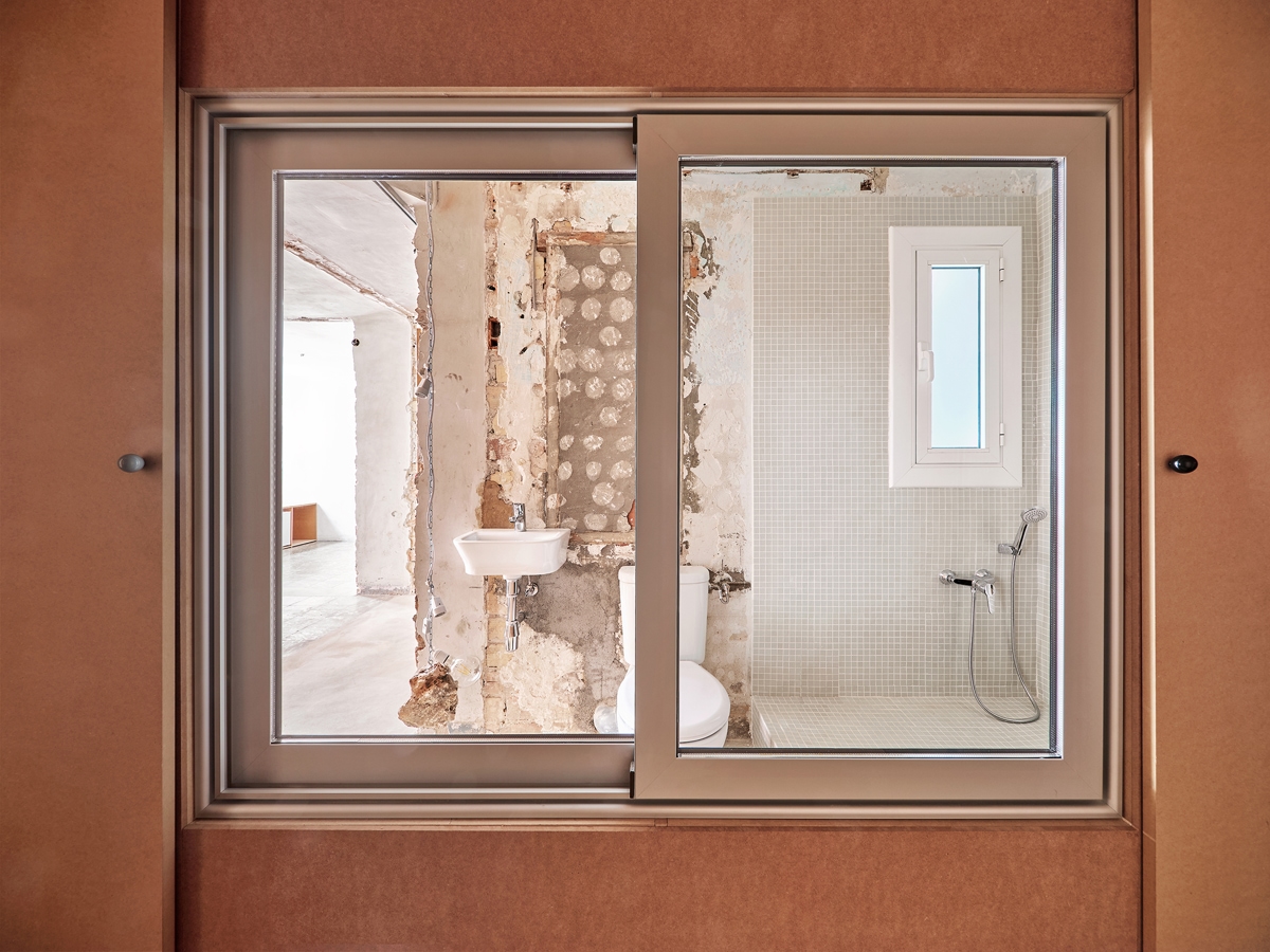 Reciklirane noge stola podižu ugrađene elemente, omogućujući da vodovodne i električne cijevi ostanu vidljive i dostupne. Površine su ostavljene bez premaza, čuvajući tragove prethodnih konfiguracija uz minimiziranje otpada i rada. Ne nanose se pločice, žbuka ili boja. Ova logika gradnje smanjuje emisije ugljika i troškove. Njegova modularna priroda omogućuje jednostavnu demontažu, održavanje i buduću prilagodbu, nudeći otporan model obnove pod trenutnim ekonomskim i ekološkim ograničenjima.”
