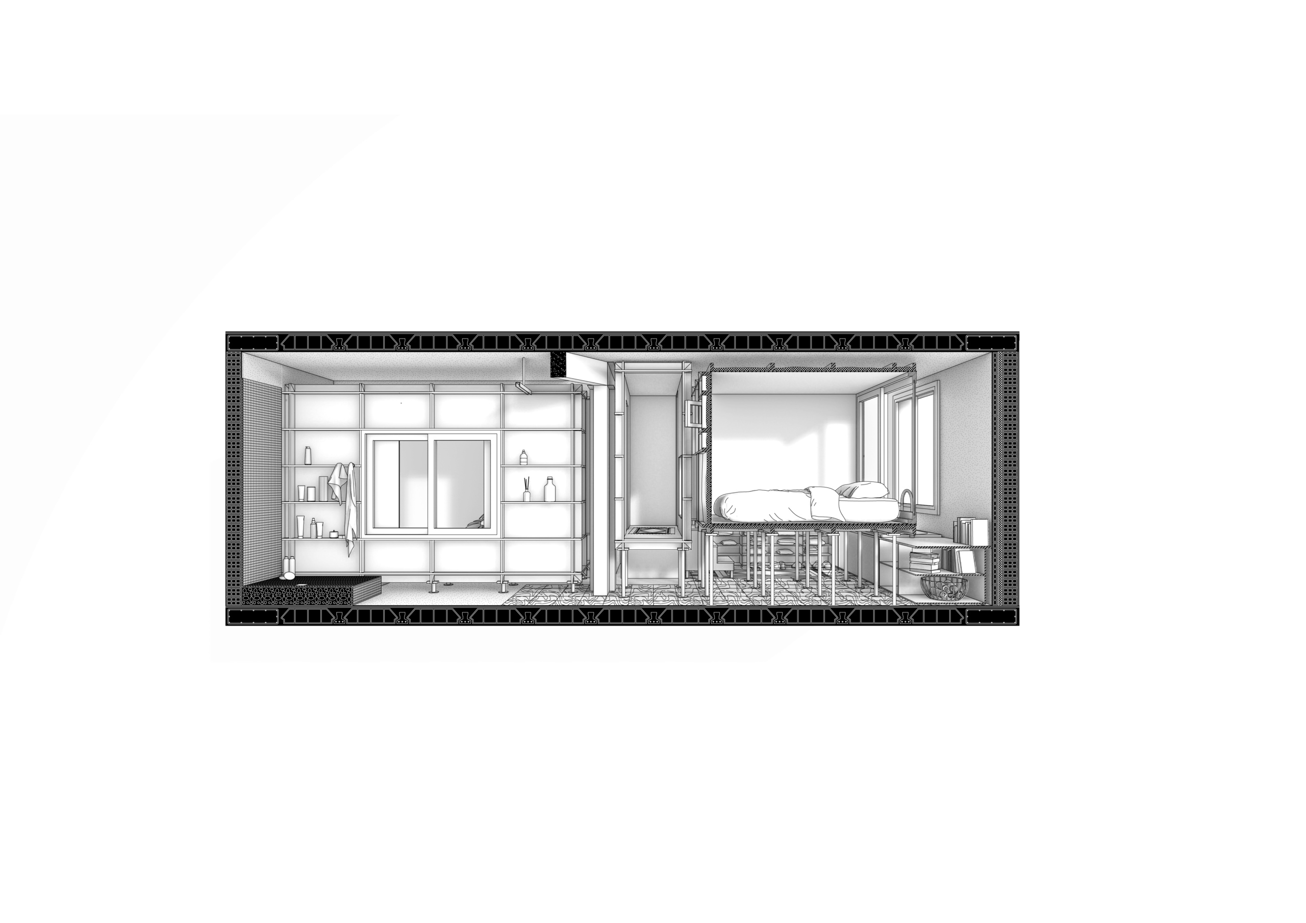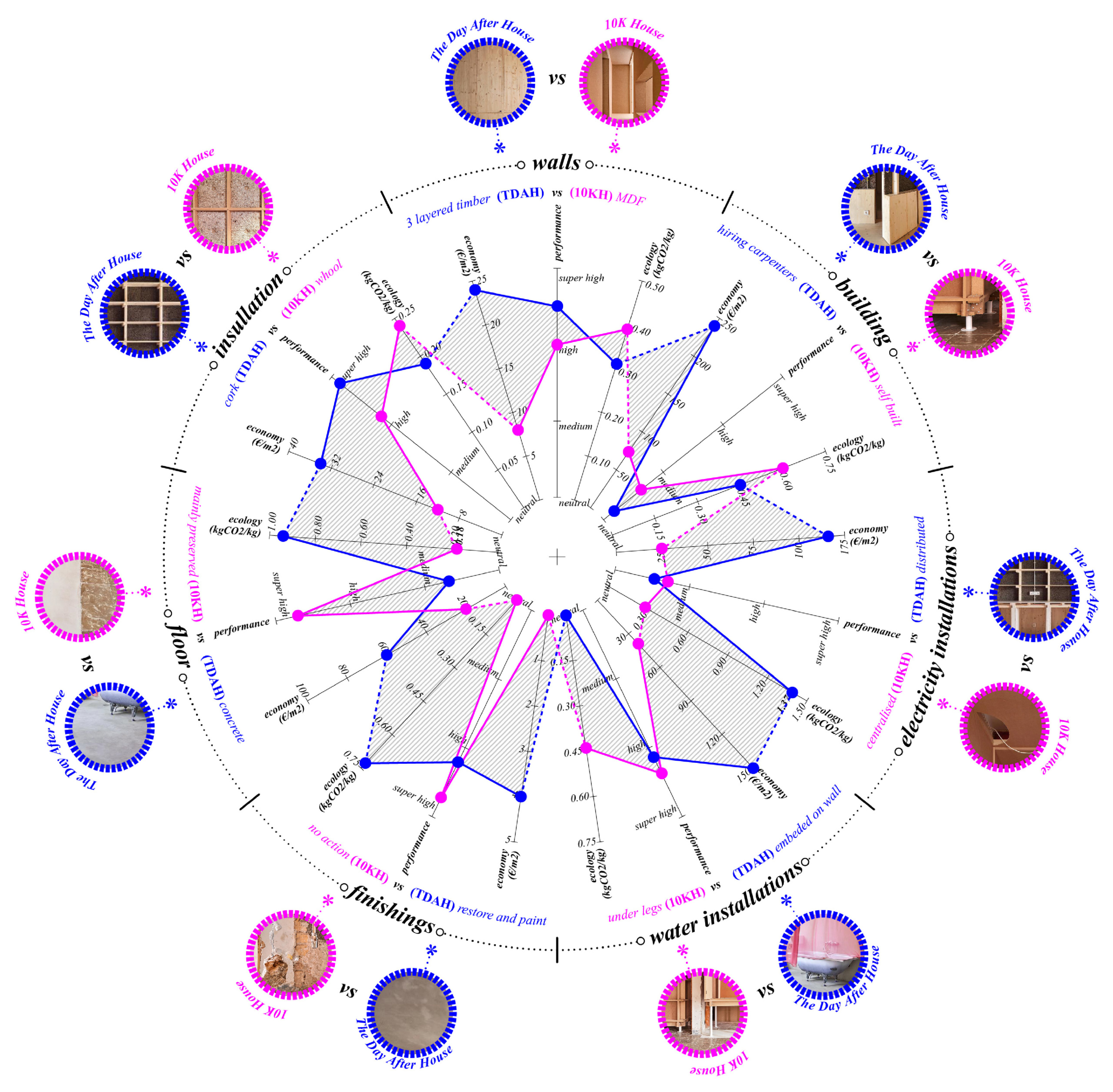 “10k House” odgovara na španjolsku kontinuiranu stambenu krizu – koja posebno pogađa mlađe generacije – istražujući kako se kućni prostor može radikalno transformirati s izuzetno ograničenim proračunom. Zamišljen kao oblik ekonomskog i ekološkog otpora, projekt teži neovisnosti od industrije fosilnih goriva za grijanje i hlađenje, testirajući nove načine na koje se arhitektura može suočiti s klimatskim promjenama na domaćoj razini. Konvencionalni raspored soba i hodnika zamjenjuje se organizacijom temeljenom na toplinskom gradijentu koja optimizira prirodne tokove topline i ventilacije. Umjesto izoliranih soba, prostori su ugniježđeni temperaturom, poboljšavajući udobnost i energetsku učinkovitost. Materijali su minimizirani i vidljivo ponovno upotrijebljeni: ne nanosi se žbuka, boja ili pločice, što omogućuje da prethodni slojevi ostanu kao tragovi sjećanja.