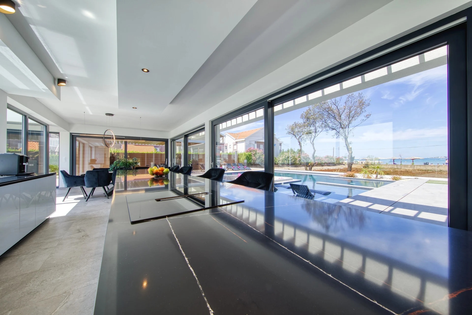 a elegantna kuhinja s prostranom blagovaonicom pruža pogled na bazen vile. Dnevni