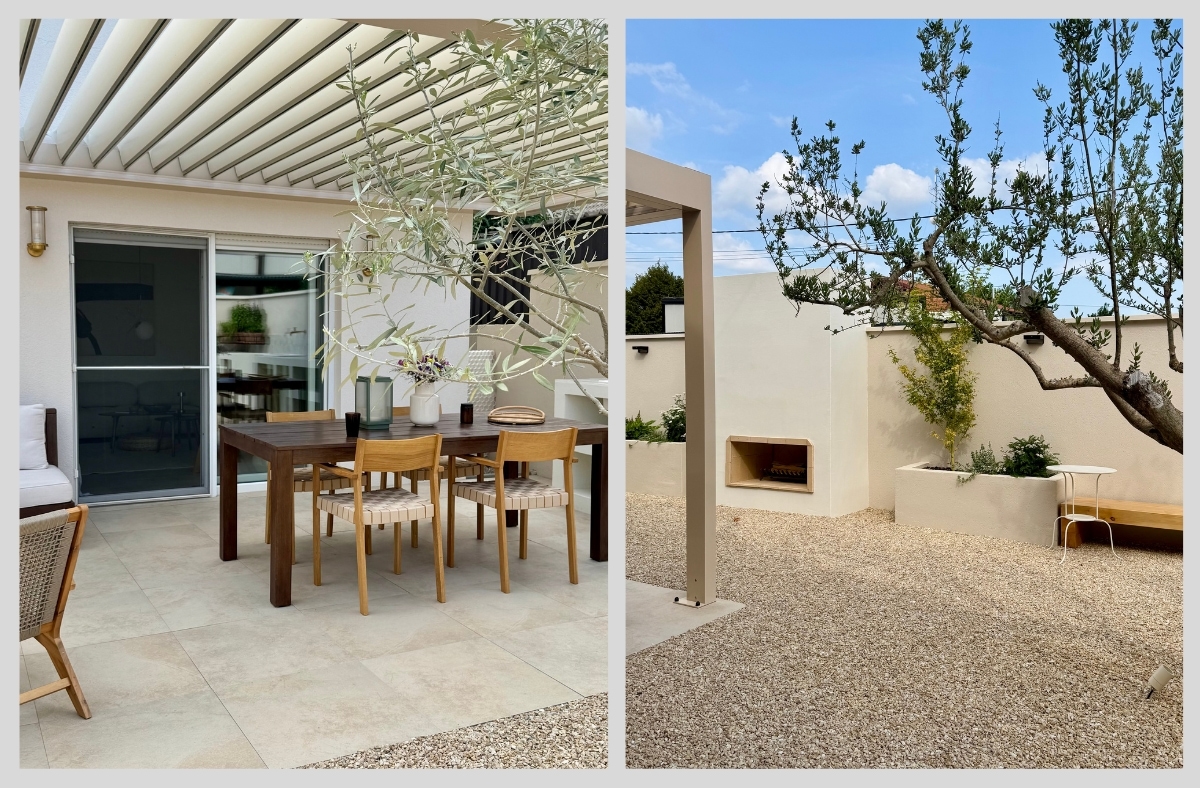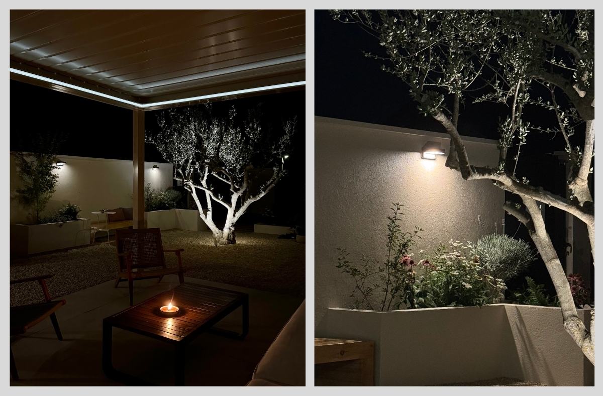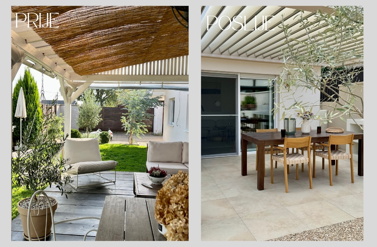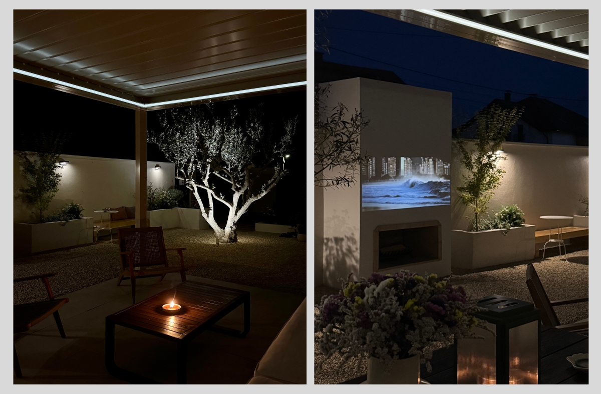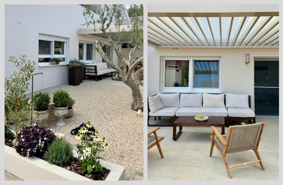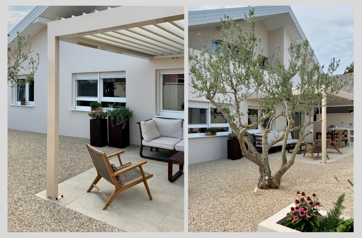 Ingrid: Za krov iznad terase odlučili smo se za bioklimatsku pergolu. To je nešto na što nam je otišlo pola krajnjeg budžeta, no u startu smo znali da ovog puta želimo trajan i funkcionalan krov. Naime, dnevni dio nam je na istoku i željeli smo krov koji od podeva možemo otvoriti tako da imamo što više svijetla. Ona je napravljena po mjeri, aluminijska, lamele se otvaraju u smjeru tako da odbijaju sunce i istovremeno kada su otvorene ( djelomično ili do kraja) stvaraju lagan povjetarac ispod nje. Pokreće je motor i ima ugrađena svijetla. Birali smo boju, konstrukcija je bež boje dok su lamele boje slonovače.