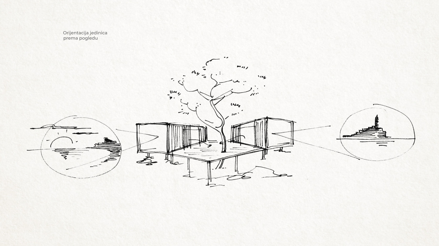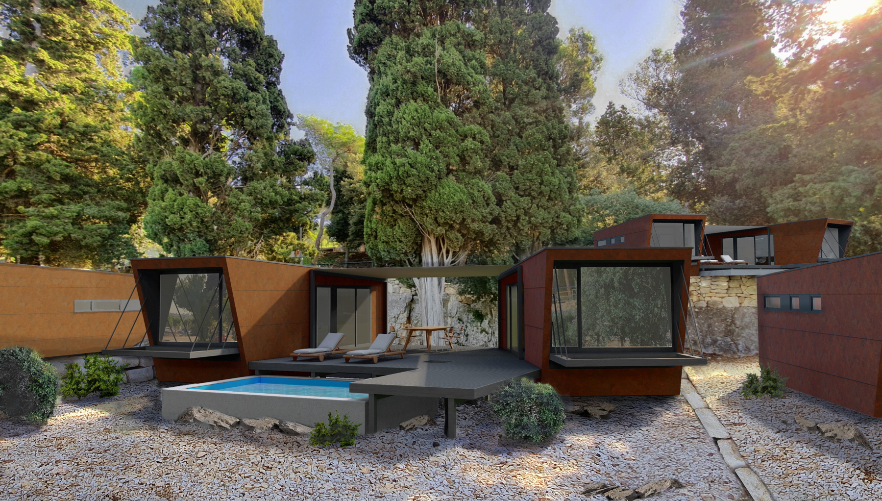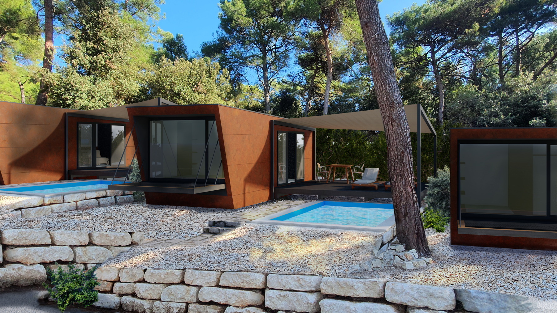 „Uklapanje u zatečen okoliš postigli smo koristeći lagane, montažne i prefabricirane konstrukcije, kao i „razbijanjem“ klasične kućice u dva modula, dnevni i spavaći trakt. Gotovo je svaka pozicija zahtijevala specifični postav, tako da je svaka jedinica kao sklop dvaju modula i terase zapravo unikatna. Moduli se na neki način „okreću za pogledom“ i time uvjetuju pozicioniranje na terenu“, pojašnjava Margita Grubiša iz arhitektonskog studija SKROZ.