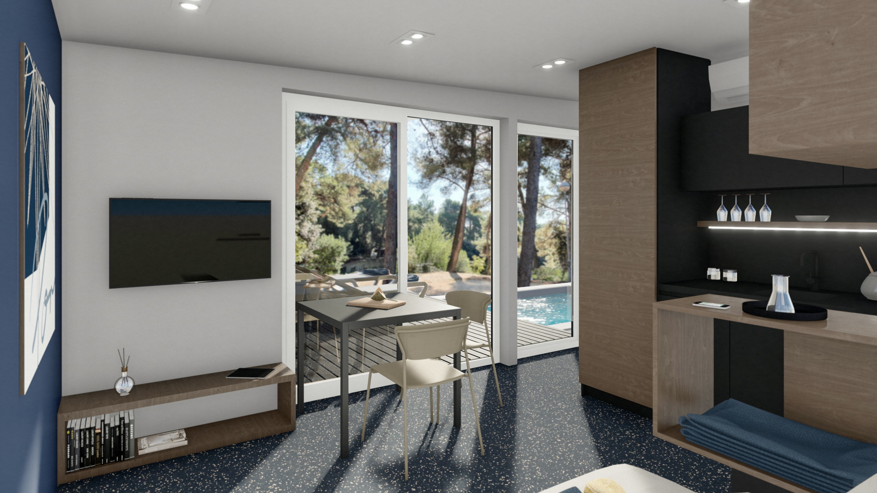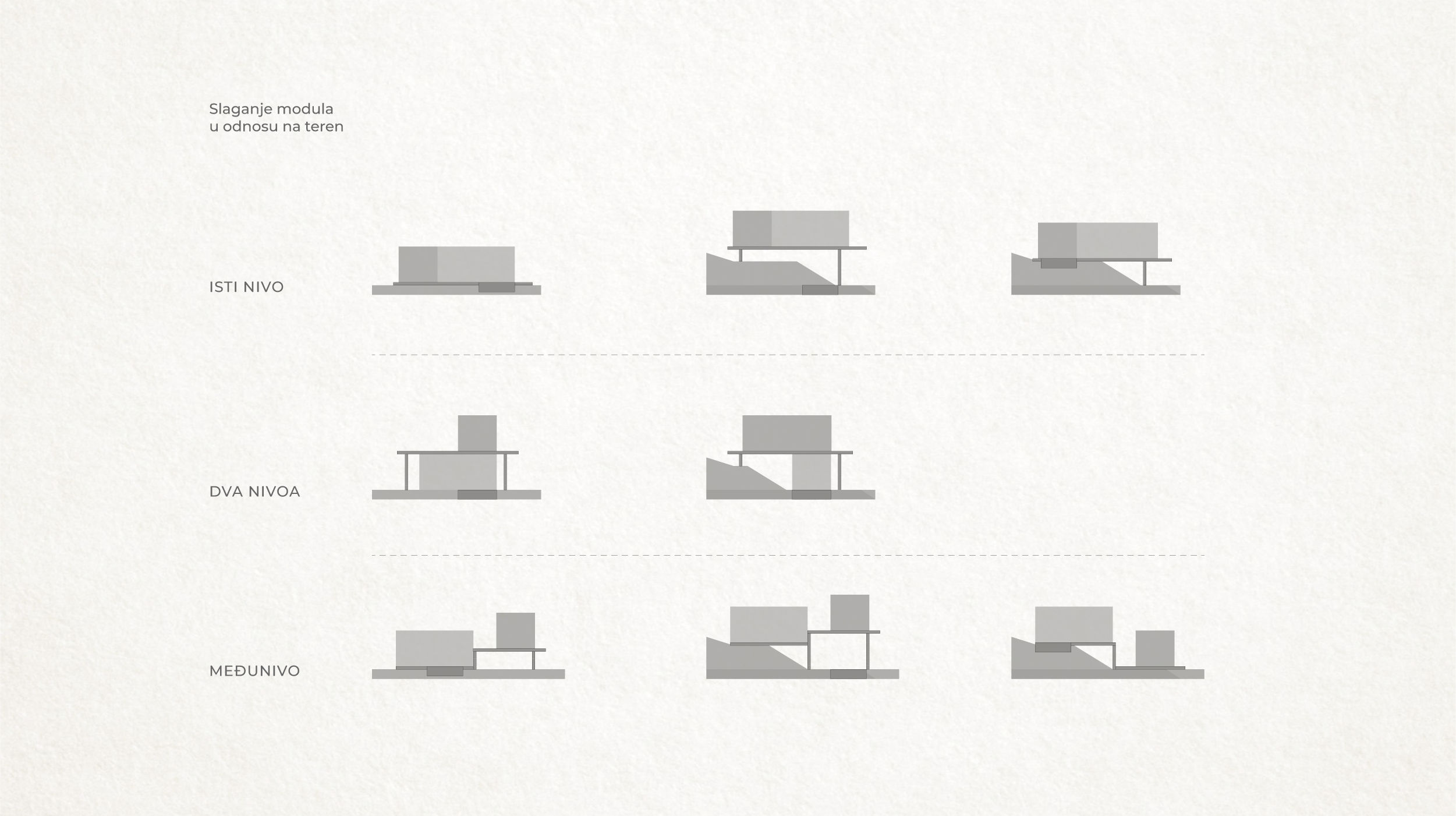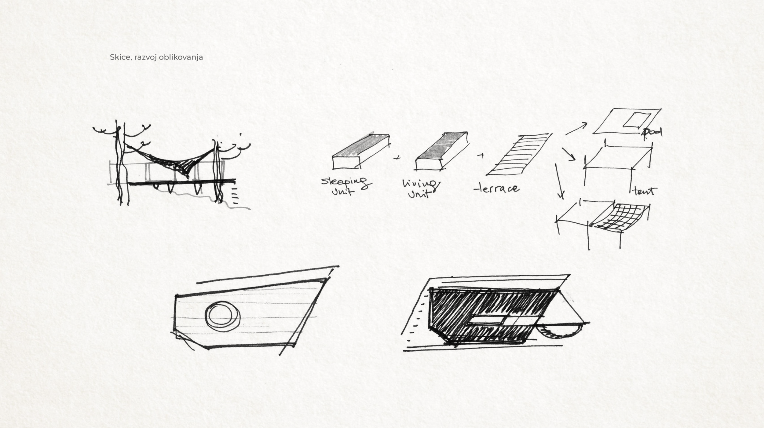 „Uklapanje u zatečen okoliš postigli smo koristeći lagane, montažne i prefabricirane konstrukcije, kao i „razbijanjem“ klasične kućice u dva modula, dnevni i spavaći trakt. Gotovo je svaka pozicija zahtijevala specifični postav, tako da je svaka jedinica kao sklop dvaju modula i terase zapravo unikatna. Moduli se na neki način „okreću za pogledom“ i time uvjetuju pozicioniranje na terenu“, pojašnjava Margita Grubiša iz arhitektonskog studija SKROZ.