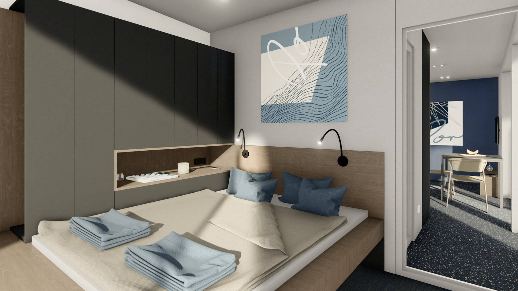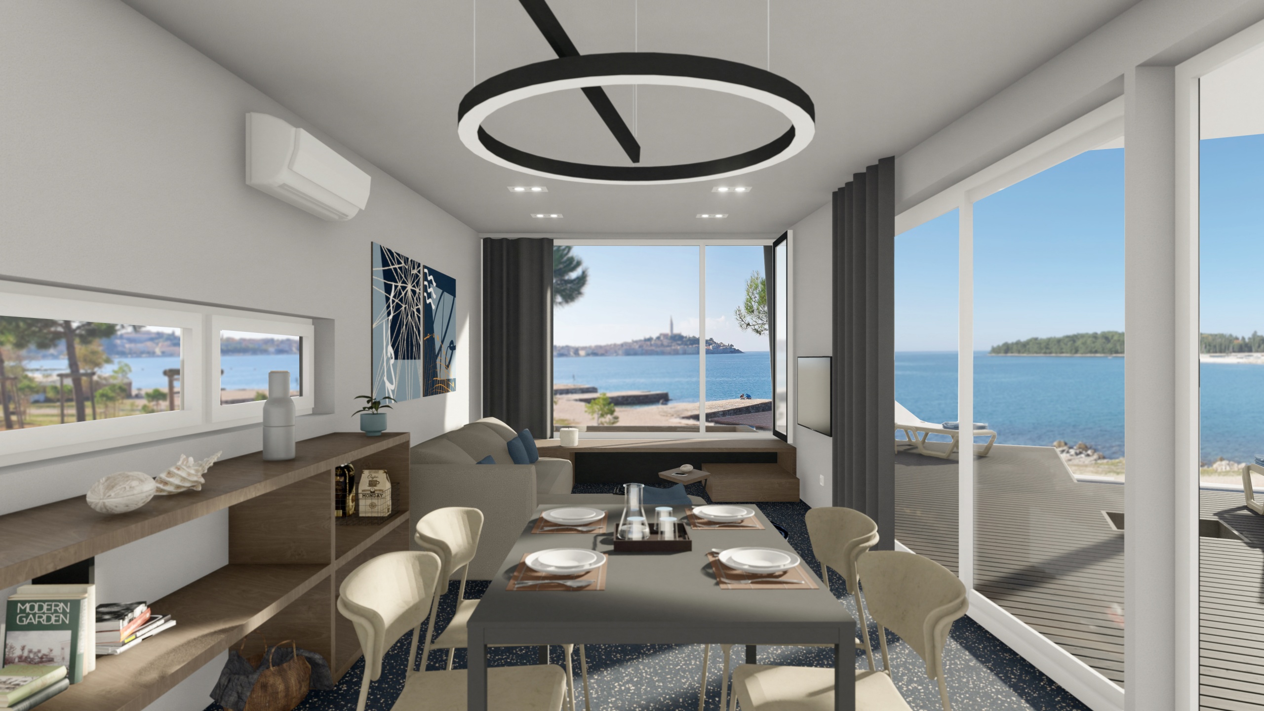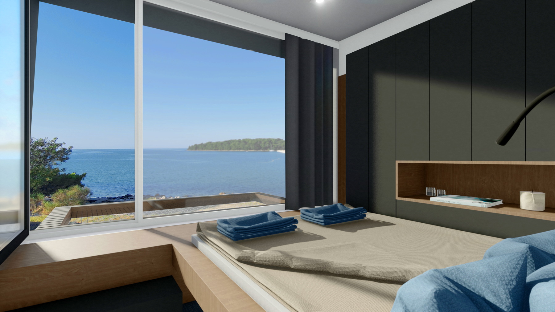 „Namjera nam je bila prenijeti doživljaj boravka na brodu. Oblikovanje je derivirano iz teme nautike i brodogradnje, ali u apstrahiranoj formi. Dojmu „umirovljene“ brodice pridonosi i materijal ovojnice modula – korten (cor-ten) – poseban oblik čelika koji je zaštićen prirodnim slojem hrđe, što za razliku od uobičajenog hladnog dojma čelika ima topliju zemljanu pojavnost, u skladu s istarskom crljenicom“, pojašnjava Margita Grubiša.