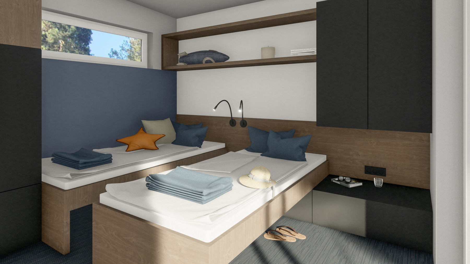 Specifičnost lokacije, osim sjenovite šume i vizura prema Rovinju, blizina je komunalne marine i suhog veza, što ju razlikuje od tipičnih glamping pozicija koje su češće u divljini. Arhitekti su tako uporište za oblikovanje pronašli u ribarskoj tradiciji Rovinja te neposrednom okruženju umirenih, usidrenih brodica.