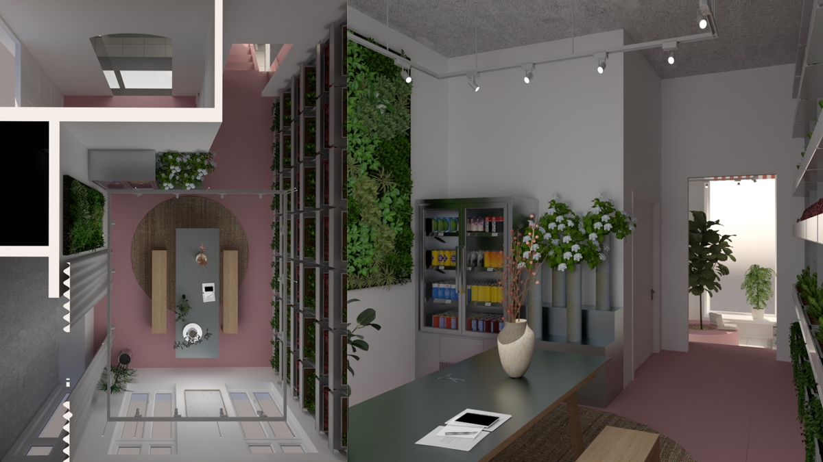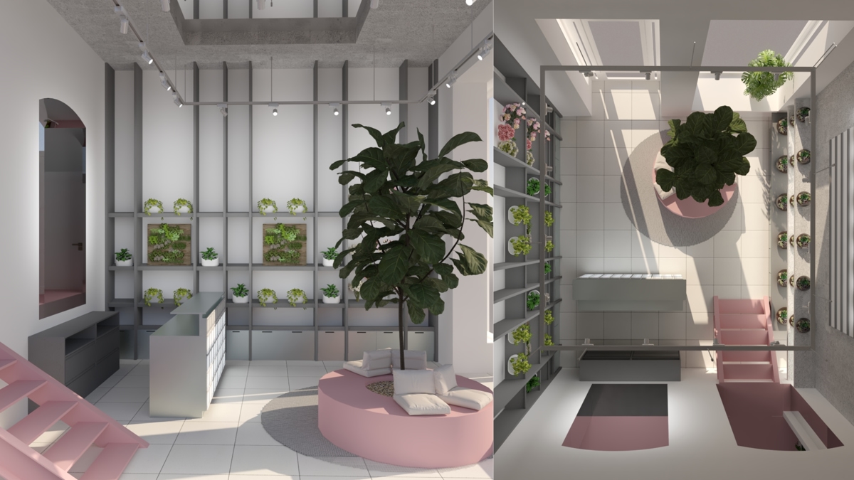 Prostor je koncipiran kao multispace s tri funkcionalne zone: prednji izložbeni dio, stražnje skladište koje je namjerno ostavljeno otvorenim kupcima te viša poluetaža za radionice i edukacije. Kupac se tako može slobodno kretati kroz cijeli prostor, vidjeti “iza kulisa” i odabrati točno onu biljku ili terarij koji mu se sviđa.