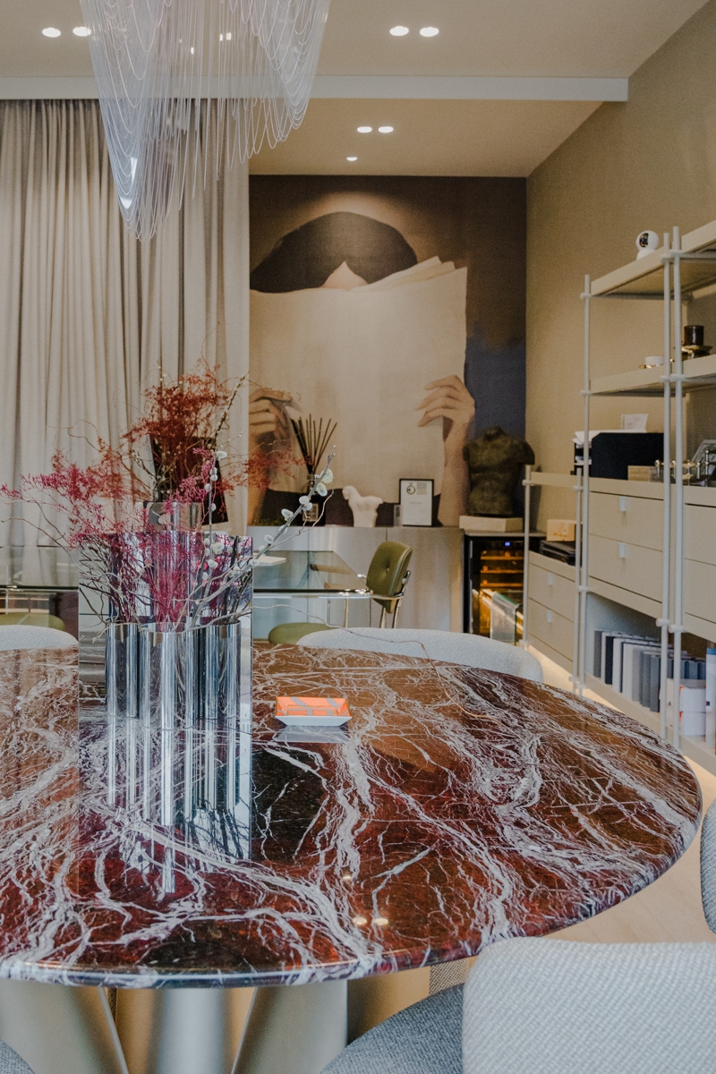 Milano, Beč, centar Zagreba? Ništa od toga. Vodimo vas u Markuševec, u ured dizajnera Ivana Mihovca iz IMM design studija, prostor kojeg se ne bi posramile ni prestižne adrese u centru Milana. Svaki detalj je pomno biran. Prostorom dominira atraktivna visilica s potpisom dizajna legendarne arhitektice Zahe Hadid, dok se sastanci odvijaju za monumentalnim mramornom stolu od Rubino Levanto mramora.