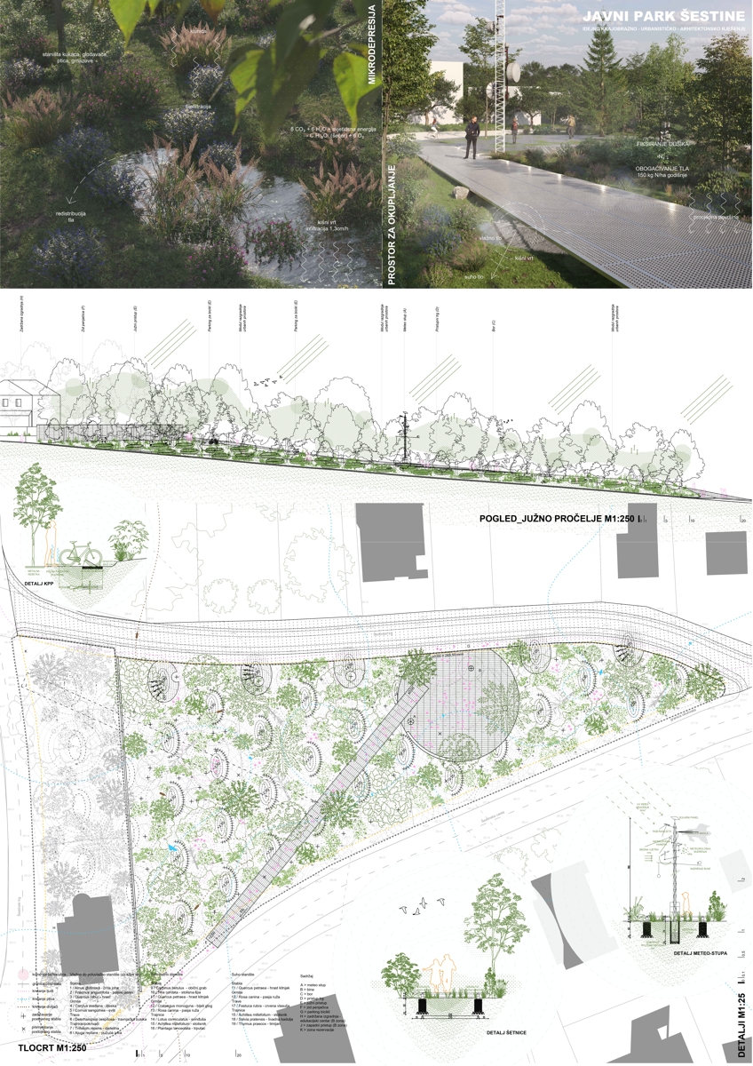 Artikulacija zelenih površina i izbor biljnog materijala u skladu su s osnovnim konceptom i krajobraznim kontekstom, doprinoseći ambijentalnoj kvaliteti prostora i njegovoj uklopljenosti u šire okruženje.