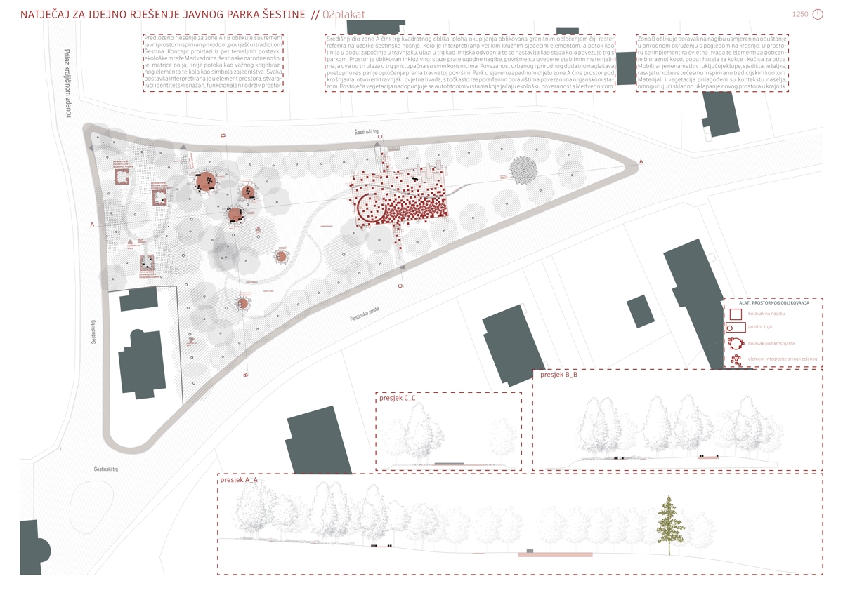 Predloženo rješenje uvažava identitetske i ambijentalne vrijednosti crkve sv. Mirka kao ključnog kulturnog i prostornog orijentira Šestina, tretirajući park kao proširenje njezina vanjskog prostora, odnosno trga. U pojedinim slojevima oblikovanja prepoznatljive značajke crkve interpretirane su suvremenim izrazom, primjerice kroz oblikovanje partera meandra inspiriranog ornamentikom krovnog pokrova crkve.