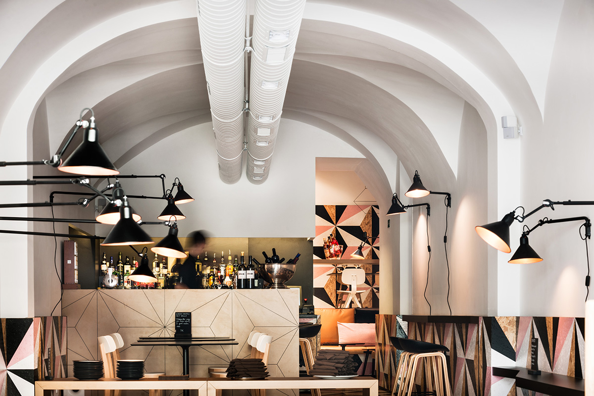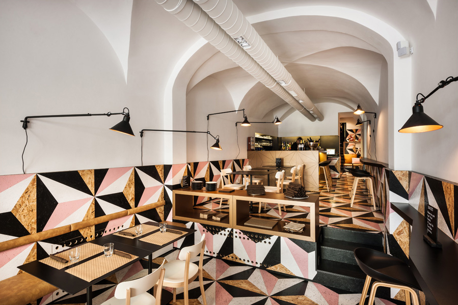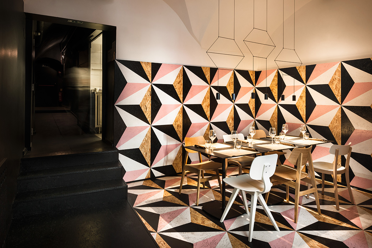 Veza između fontane i ovoga interijera nije slučajna i ostavlja snažan dojam na posjetitelje. Glavno i vrlo prepoznatljivo obilježje prostora čini 1200 trokuta koji stvaraju snažnu, jedinstvenu strukturu koja se proteže kroz čitav lokal.