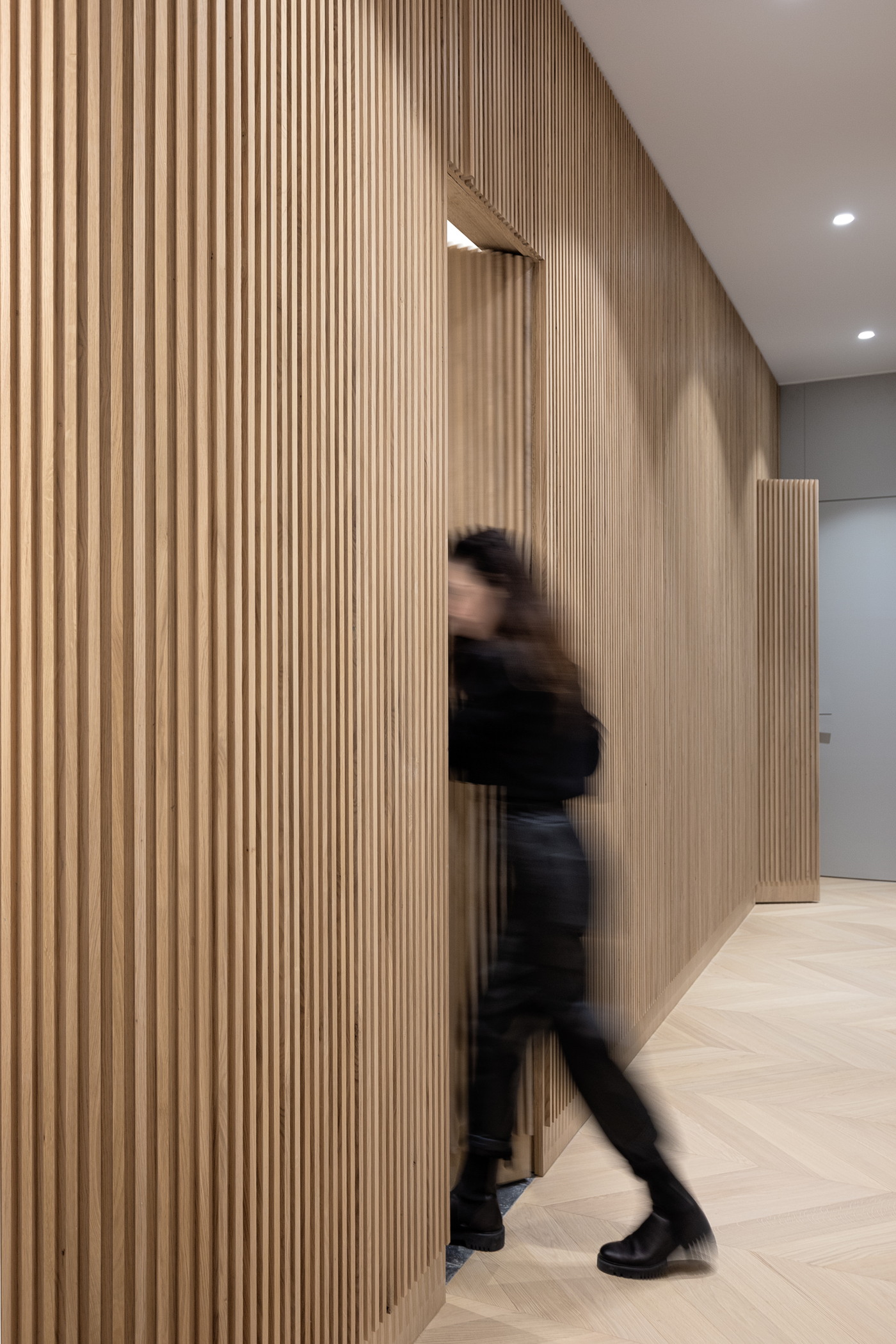 Na podu je parket chevron, sav namještaj, nizak, minimalan, posebno biran.
