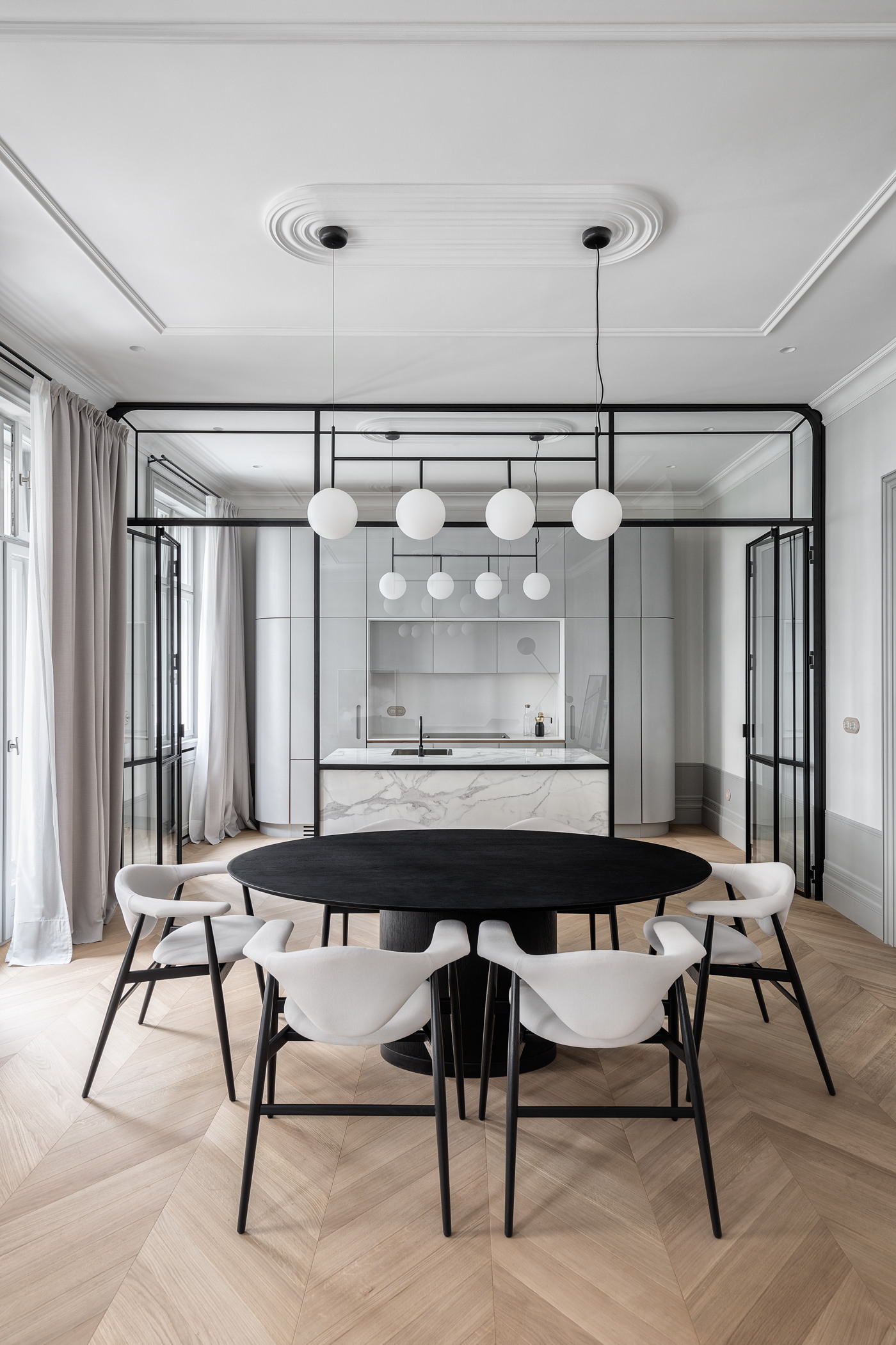 Centralni dio dnevne zone je ručno rađen blagovaonski stol napravljen od crnog hrasta, a atraktivnost se podiže sa središnjom staklenom pregradom od stakla i crnog čelika napravljanoj u talijanskoj tvornici.