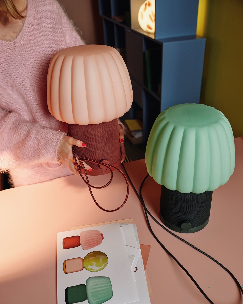 KULGLASS čine dvije lampe-zvučnici u nijansama zelene i crveno-smeđe s ružičastim detaljima, koje spajaju svjetlo, zvuk i boju u jedan proizvod.
